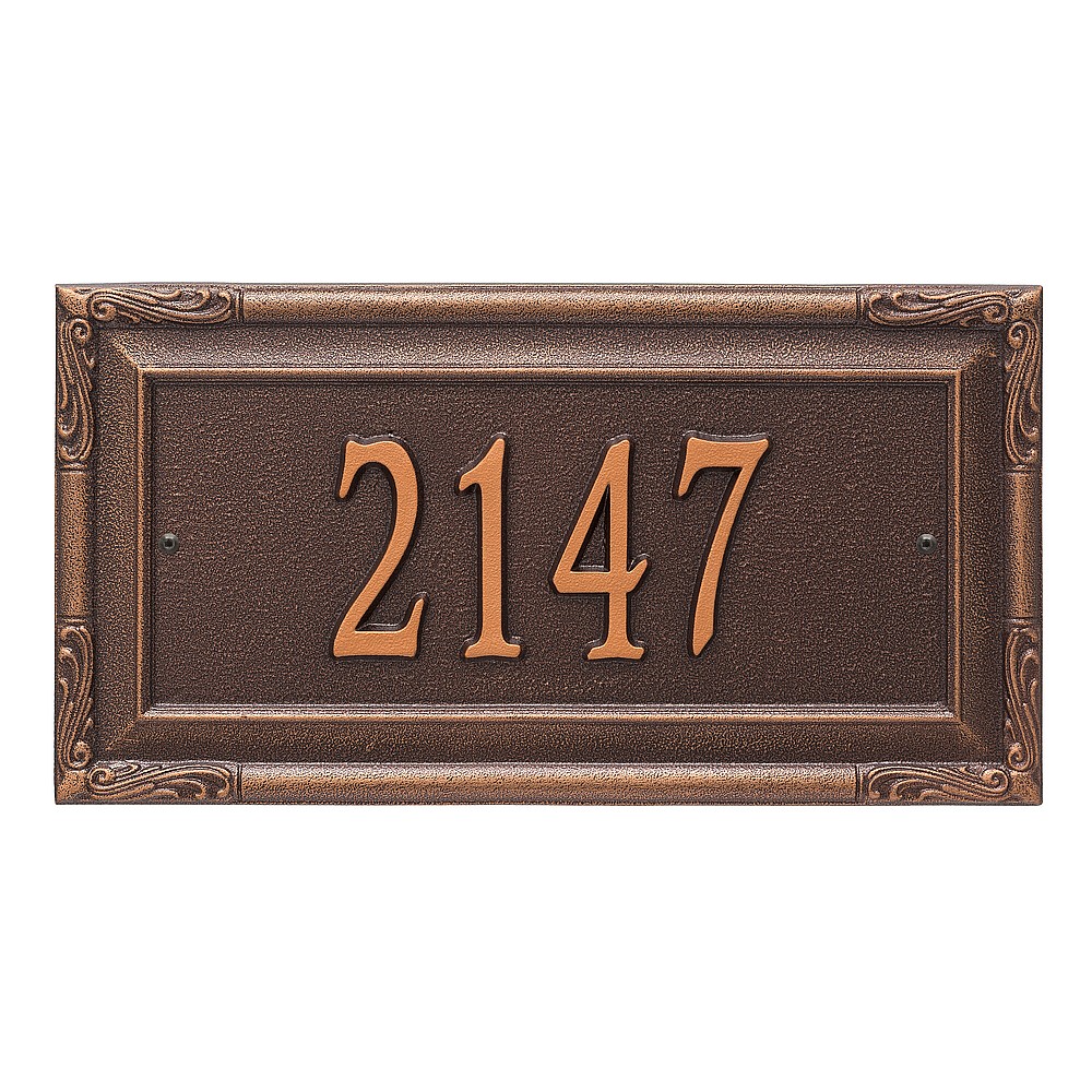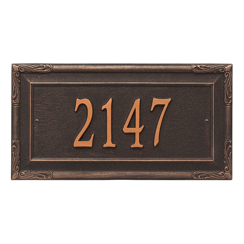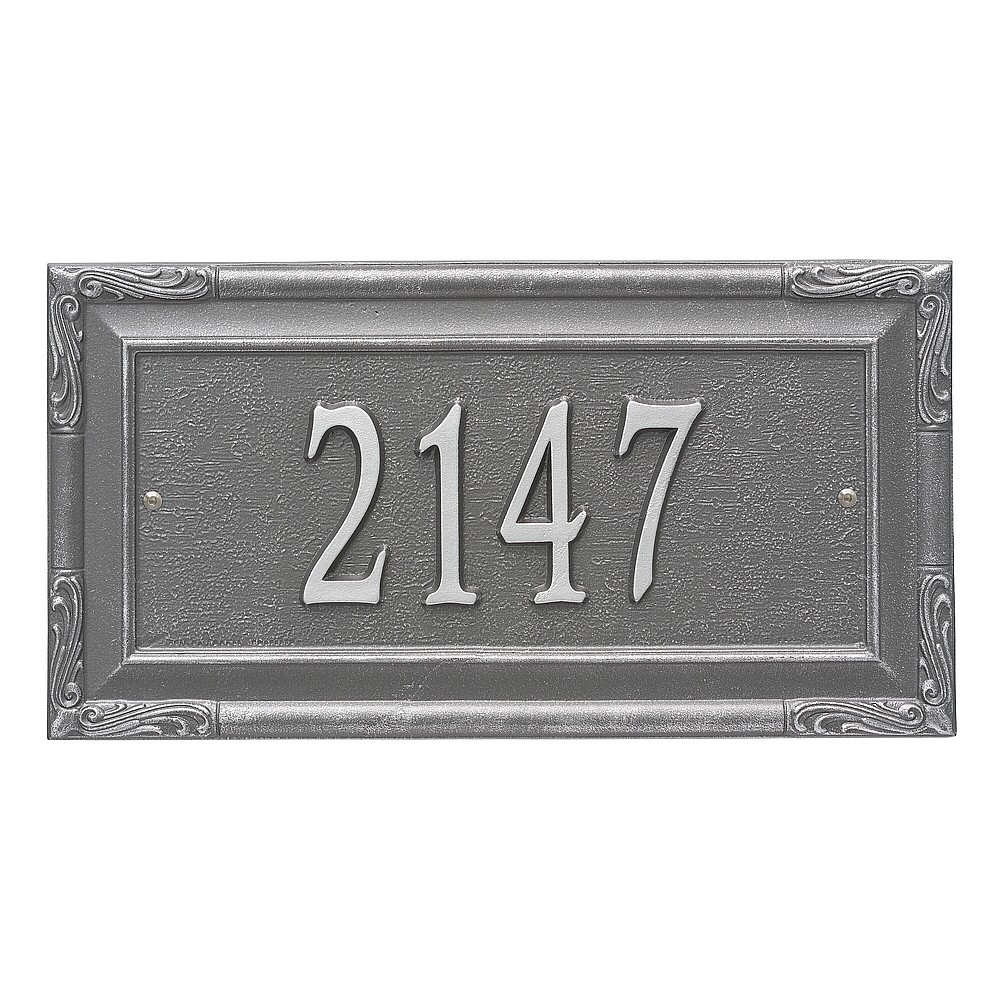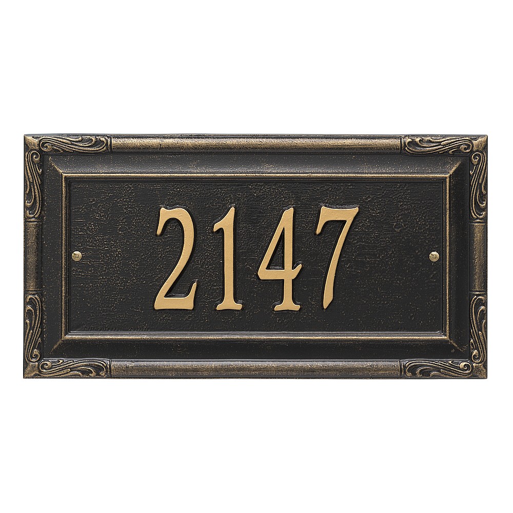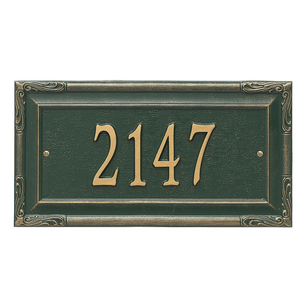 Dimensions (L x W x H): 18 x 9.5 x .375 The Whitehall Gardengate personalized plaque adds instant curb appeal to your home address numbers. The Gardengate plaque features traditional styling and a simulated carved wood accent. Every Whitehall plaque is proudly hand crafted in the USA. Personalization is permanently cast into the sign. Manufactured from cast, high-density aluminum alloy and protected by our exclusive Alumi-Shield all weather coatings. Alumi-Shield All Weather Coating: A Whitehall Exclusive Alumi-Shield – Protects against the harshest weather and environmental elements. Extends the product life and maintains the look and function. Made in the USA.