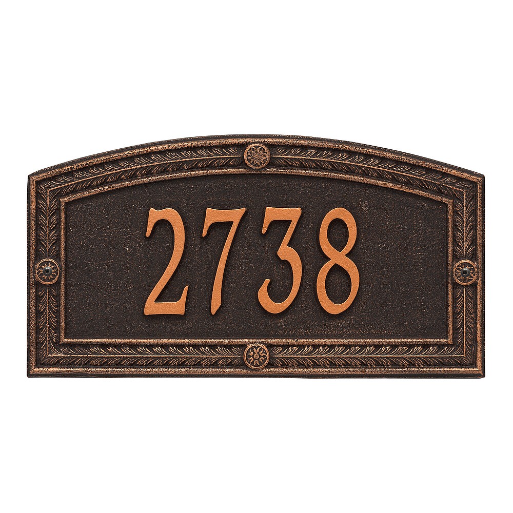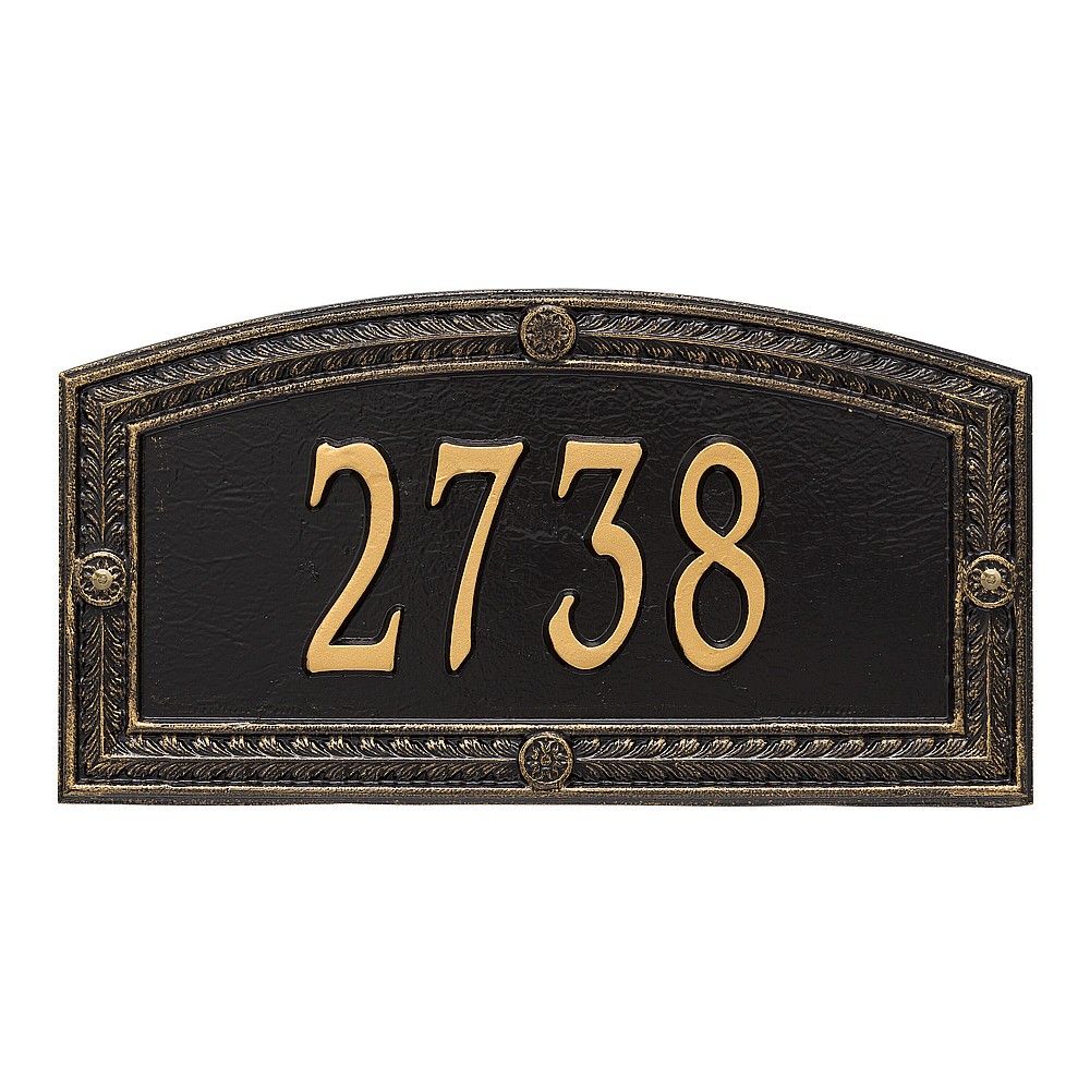 Dimensions (L x W x H): 17 x 9 x .375 The Hamilton personalized plaque is a great way to add instant curb appeal. The Hamilton’s Roman arch shape and highly decorative border combine classic architecture with fine detail. The final finish is brushed by hand to enhance each detail. Every Whitehall plaque is proudly hand crafted in the USA. Personalization is permanently cast into the sign. Manufactured from cast, high-density aluminum alloy and protected by our exclusive Alumi-Shield all weather coatings. Alumi-Shield All Weather Coating: A Whitehall Exclusive Alumi-Shield – Protects against the harshest weather and environmental elements. Extends the product life and maintains the look and function. Made in the USA.