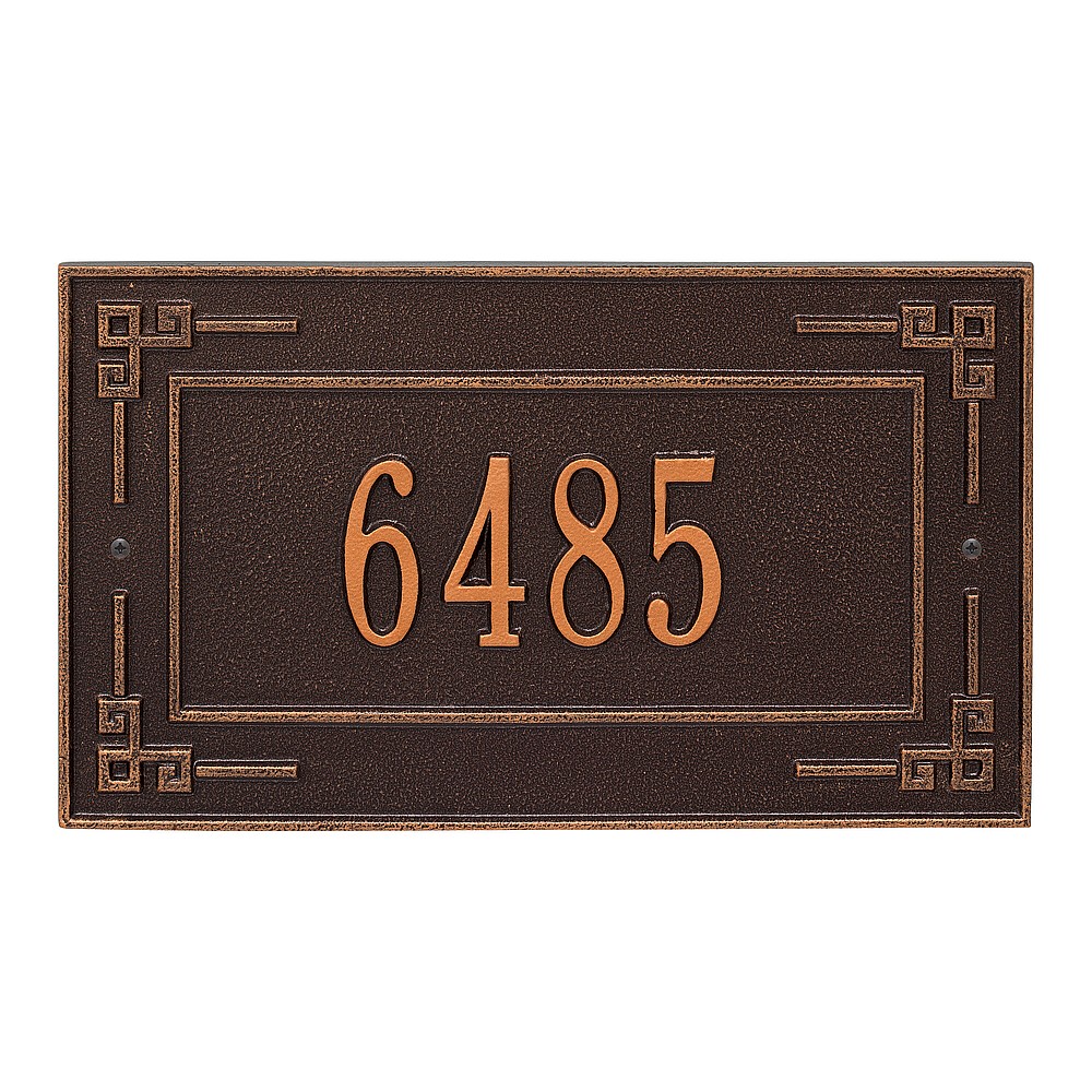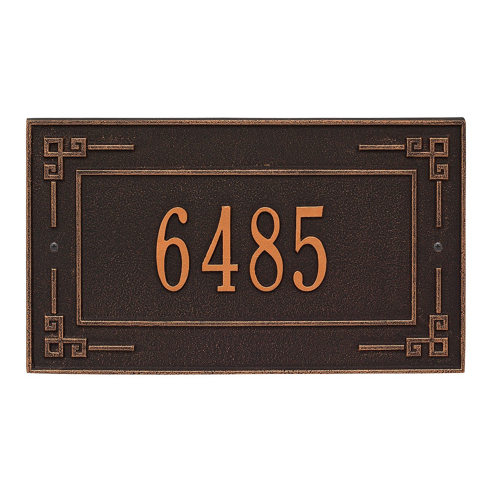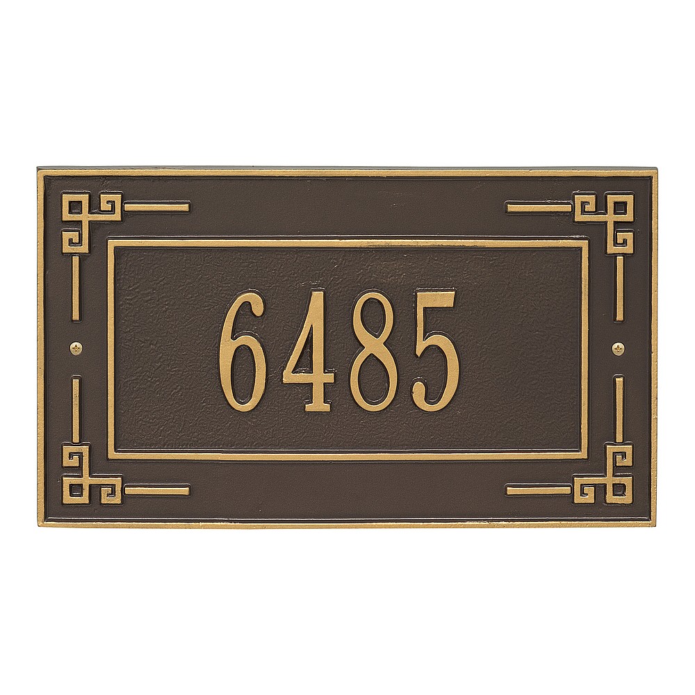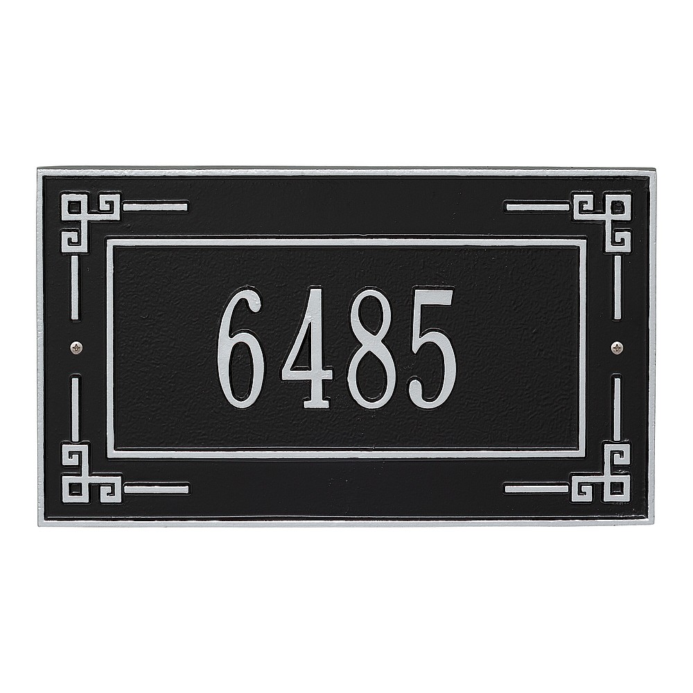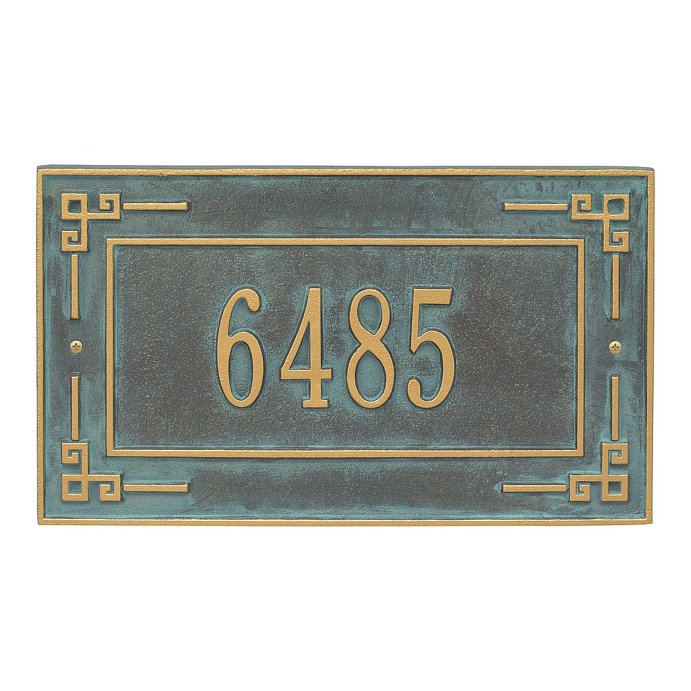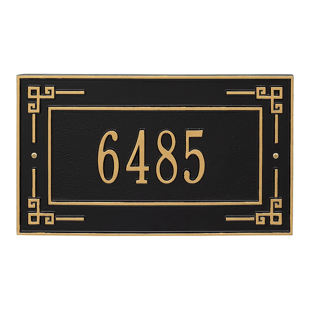Dimensions (L x W x H): 16 x 9 x .375 The Whitehall Key Corner personalized plaque is a unique way to add instant curb appeal. The Greek art inspired accents of the Key Corner plaque and linear inner border make this sign unique and eye catching. Every Whitehall plaque is proudly hand crafted in the USA. Personalization is permanently cast into the sign. Manufactured from cast, high-density aluminum alloy and protected by our exclusive Alumi-Shield all weather coatings. Alumi-Shield All Weather Coating: A Whitehall Exclusive Alumi-Shield – Protects against the harshest weather and environmental elements. Extends the product life and maintains the look and function. Made in the USA.