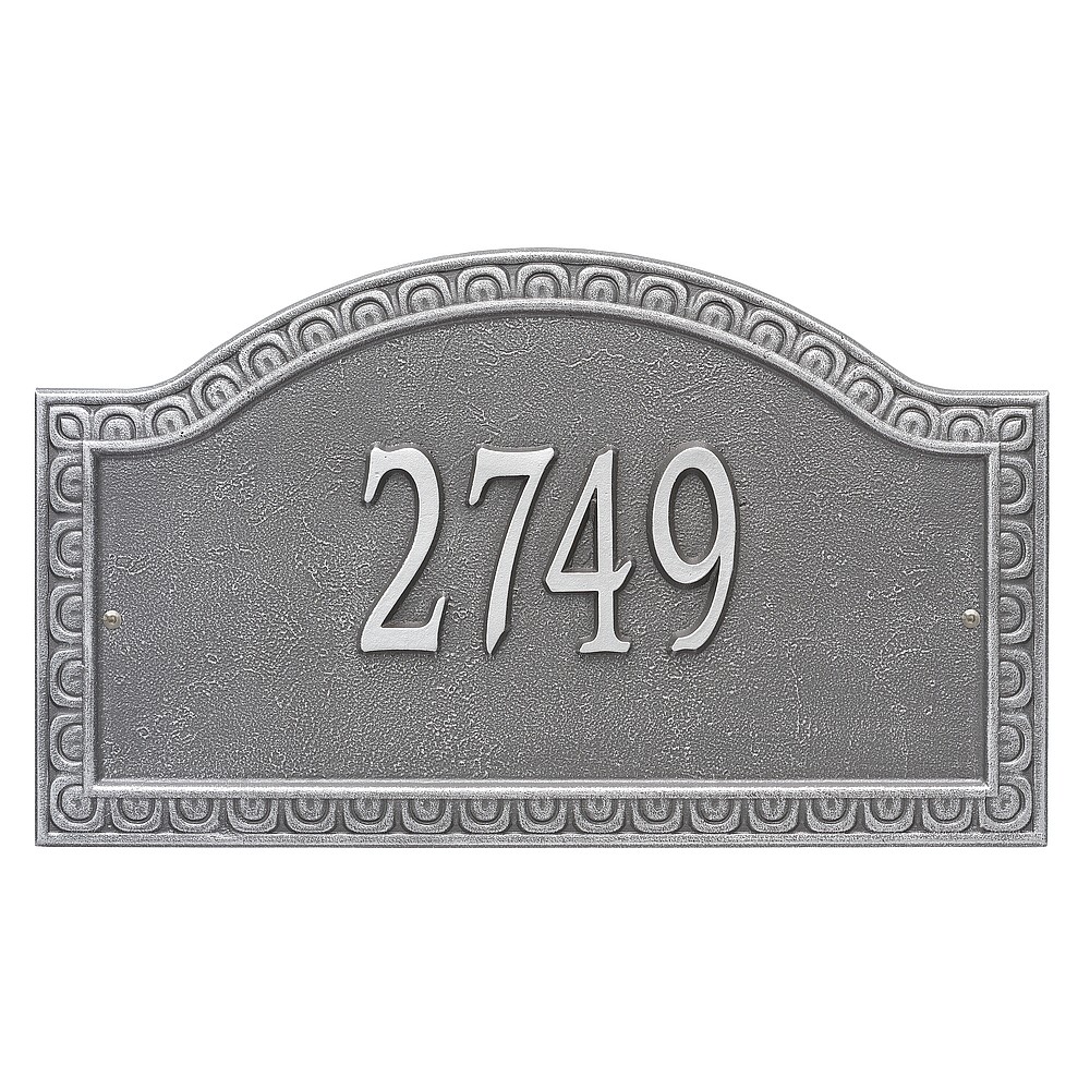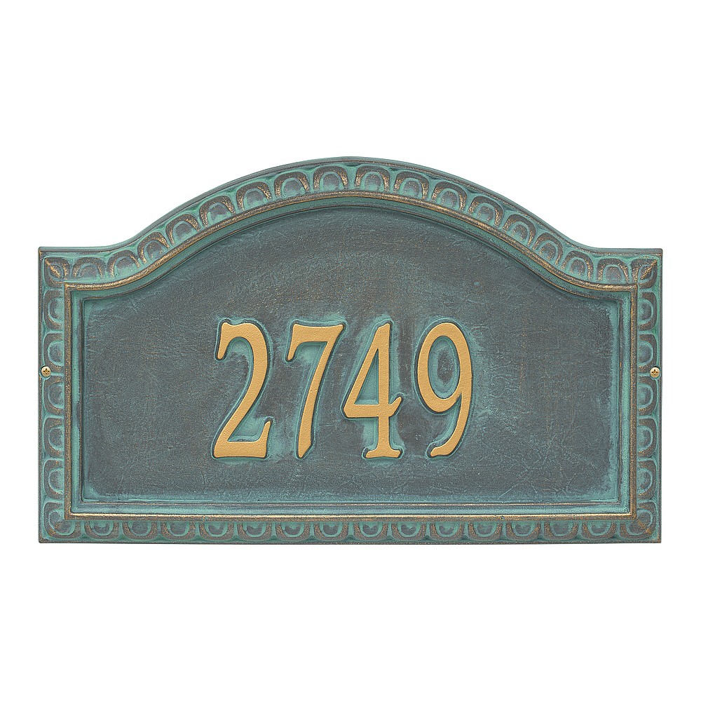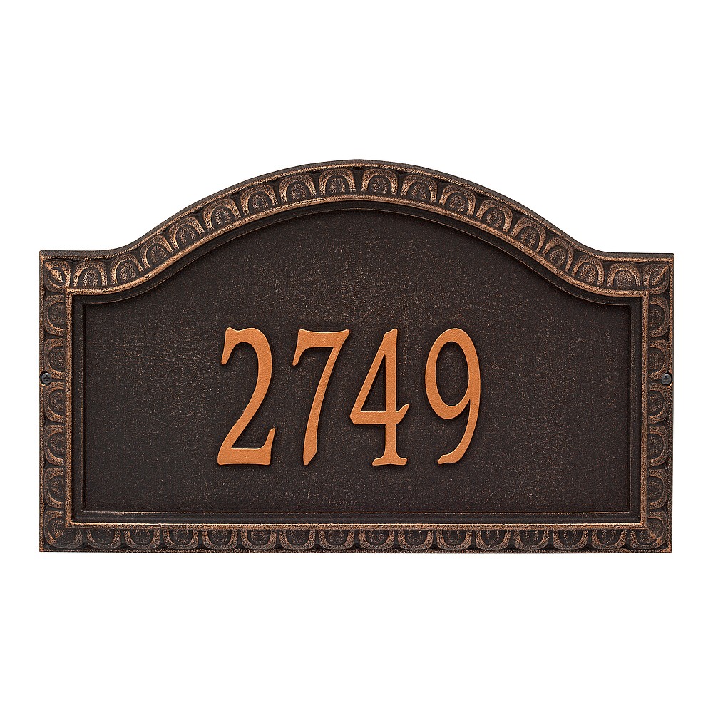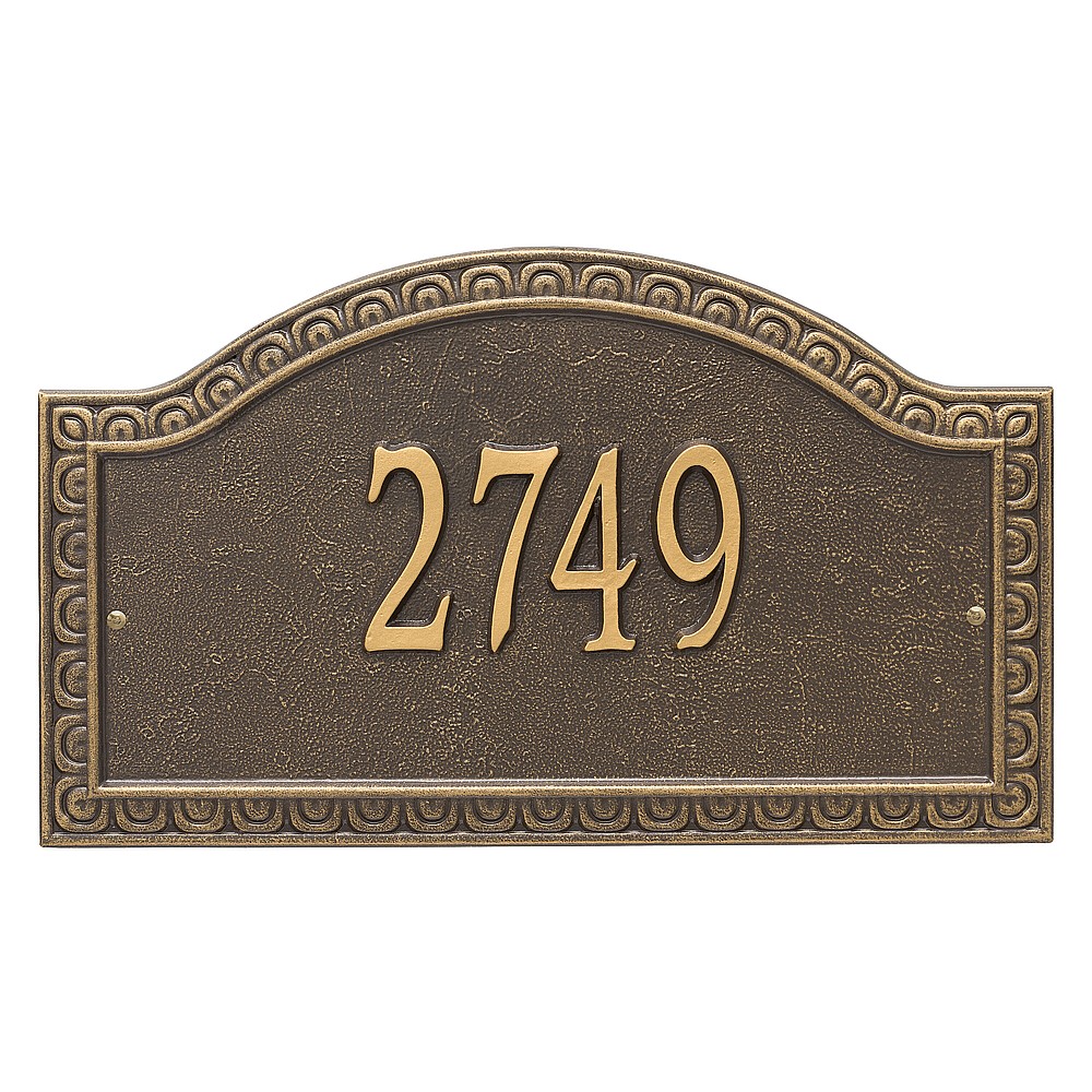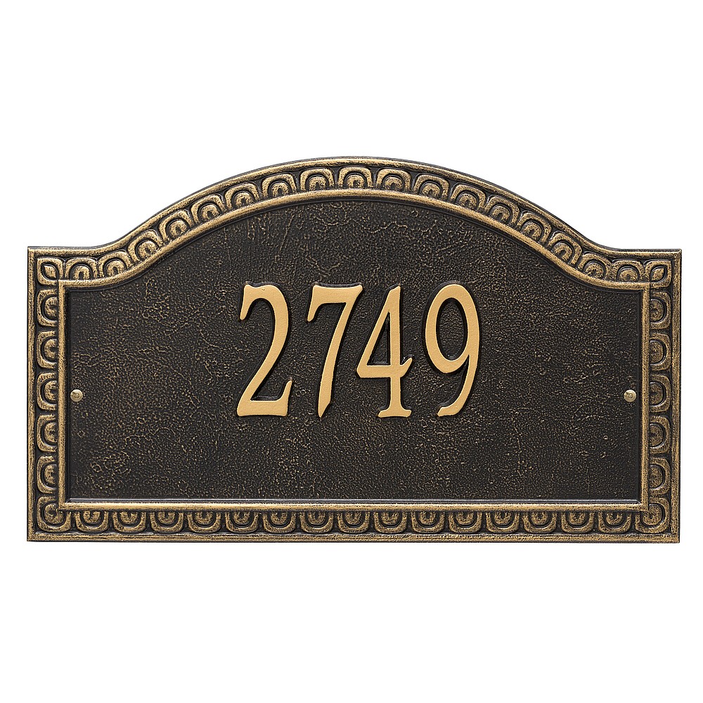 Dimensions (L x W x H): 19.5 x 11.5 x .375 The Whitehall Penhurst personalized plaque adds instant curb appeal to your home address numbers. A detailed scalloped border frames the edges of the Penhurst plaques classic arch design. Every Whitehall plaque is proudly hand crafted in the USA. Personalization is permanently cast into the sign. Manufactured from cast, high-density aluminum alloy and protected by our exclusive Alumi-Shield all weather coatings. Alumi-Shield All Weather Coating: A Whitehall Exclusive Alumi-Shield – Protects against the harshest weather and environmental elements. Extends the product life and maintains the look and function. Made in the USA.