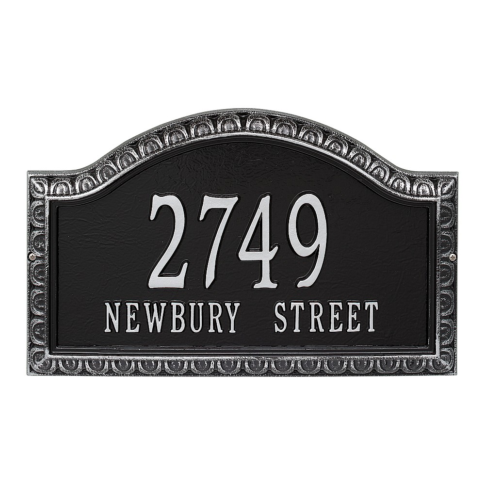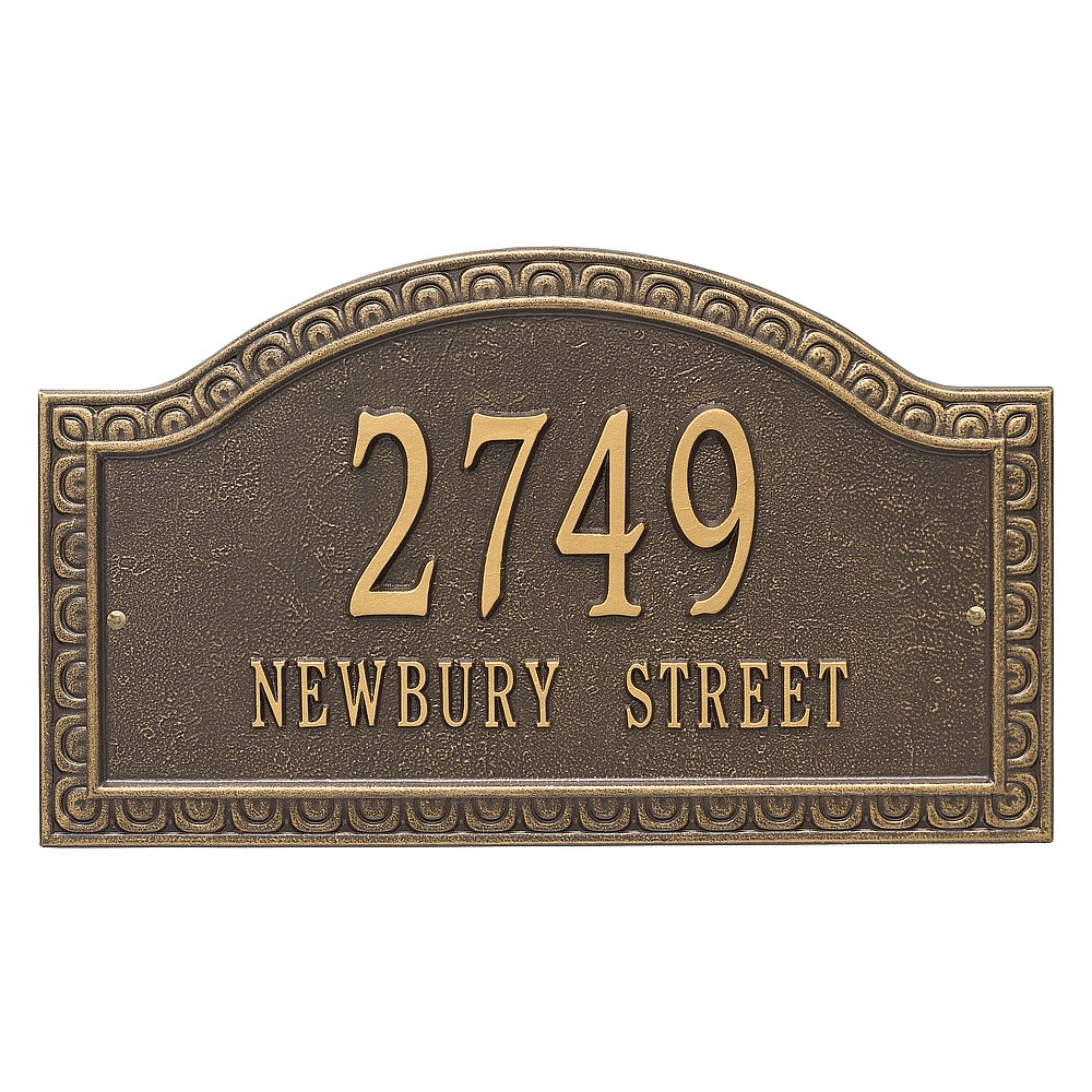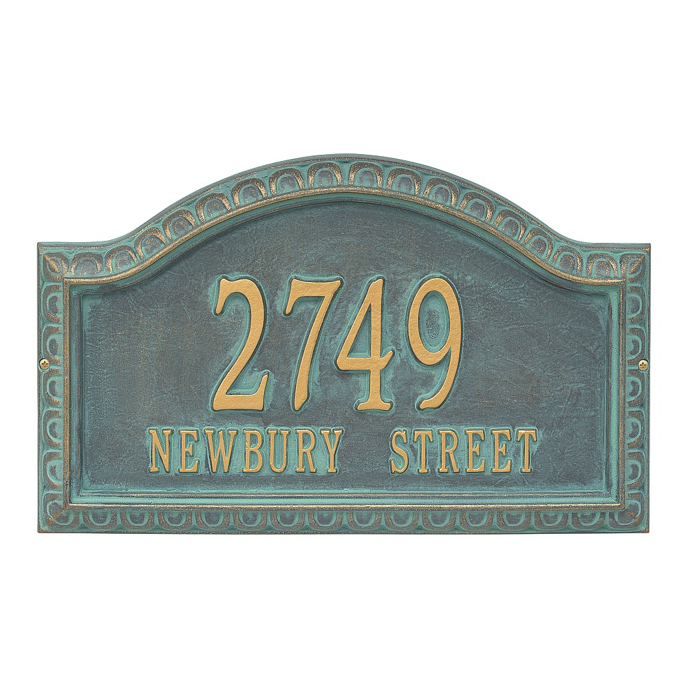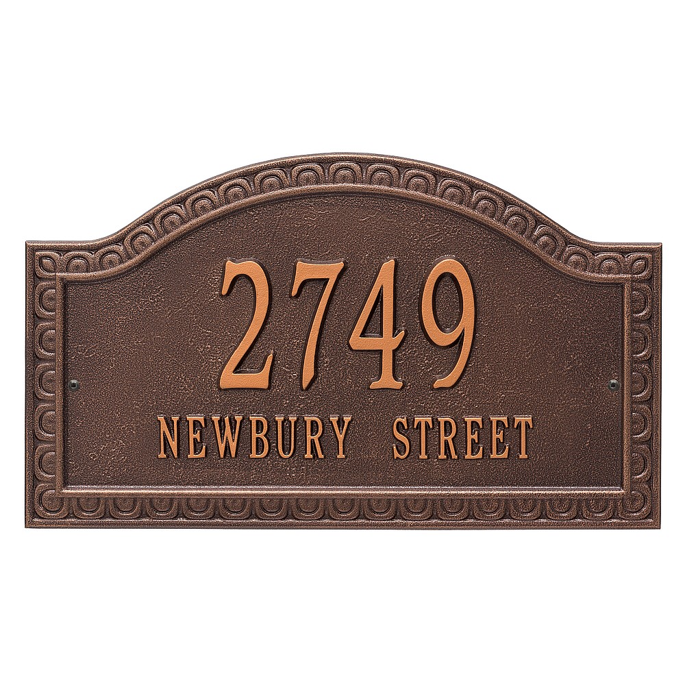 Dimensions (L x W x H): 19.5 x 11.5 x .375 The Whitehall Penhurst personalized plaque adds instant curb appeal to your home address numbers. A detailed scalloped border frames the edges of the Penhurst plaques classic arch design. Every Whitehall plaque is proudly hand crafted in the USA. Personalization is permanently cast into the sign. Manufactured from cast, high-density aluminum alloy and protected by our exclusive Alumi-Shield all weather coatings. Alumi-Shield All Weather Coating: A Whitehall Exclusive Alumi-Shield – Protects against the harshest weather and environmental elements. Extends the product life and maintains the look and function. Made in the USA.