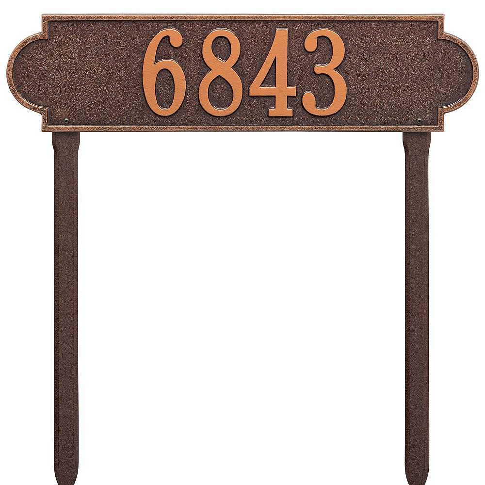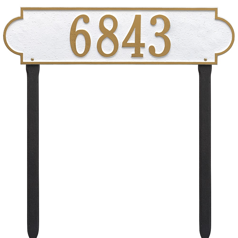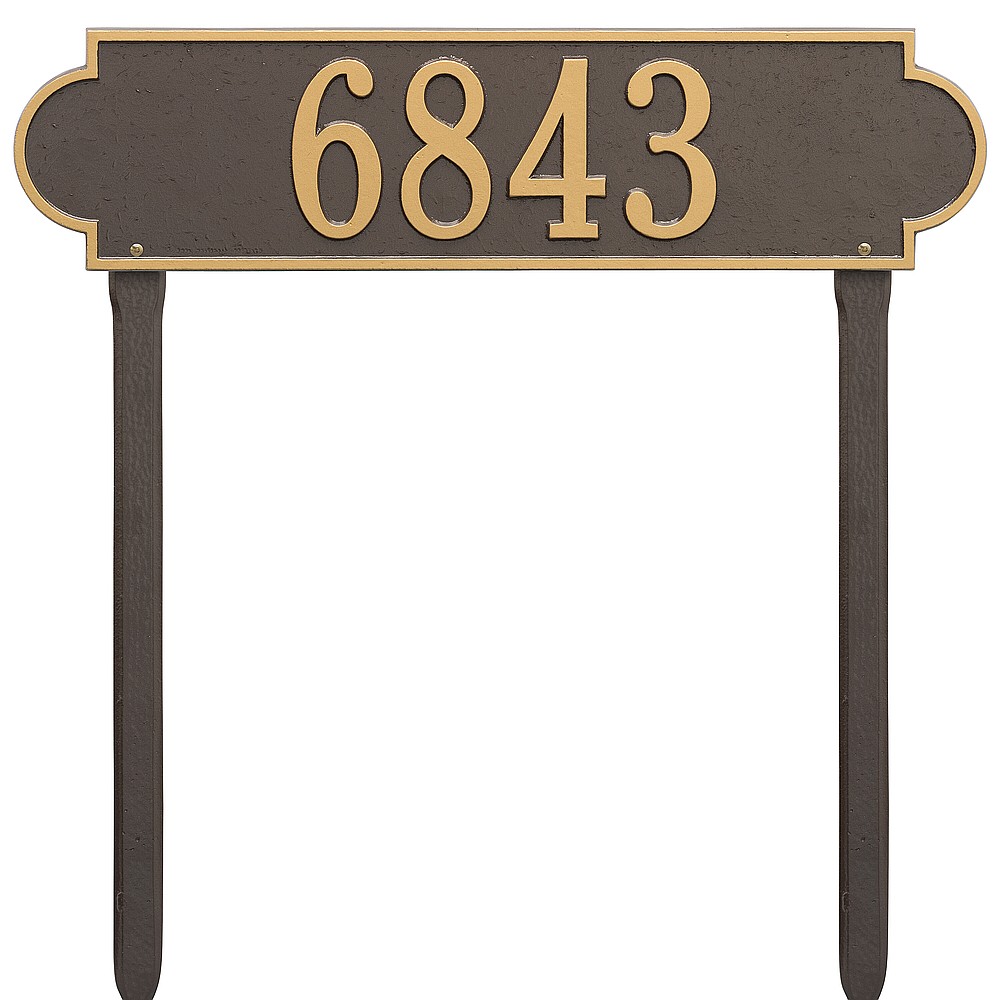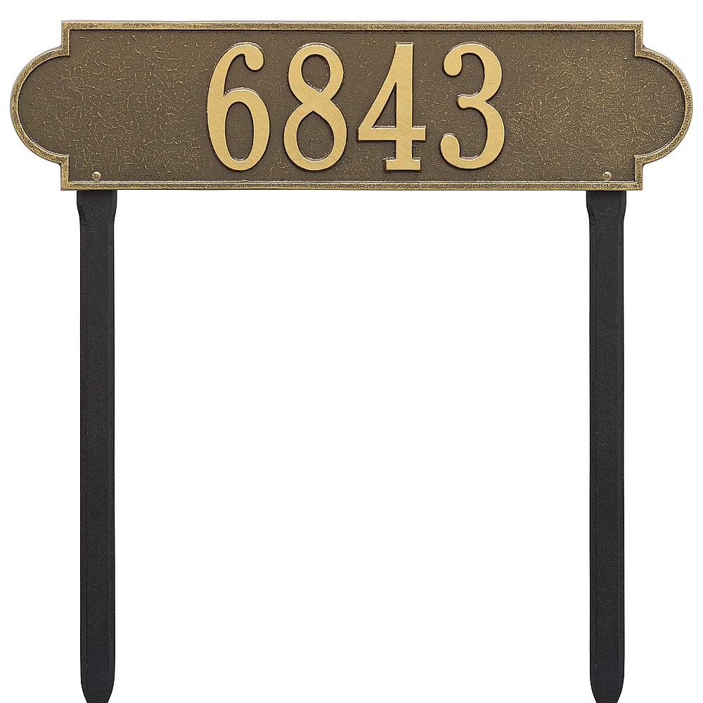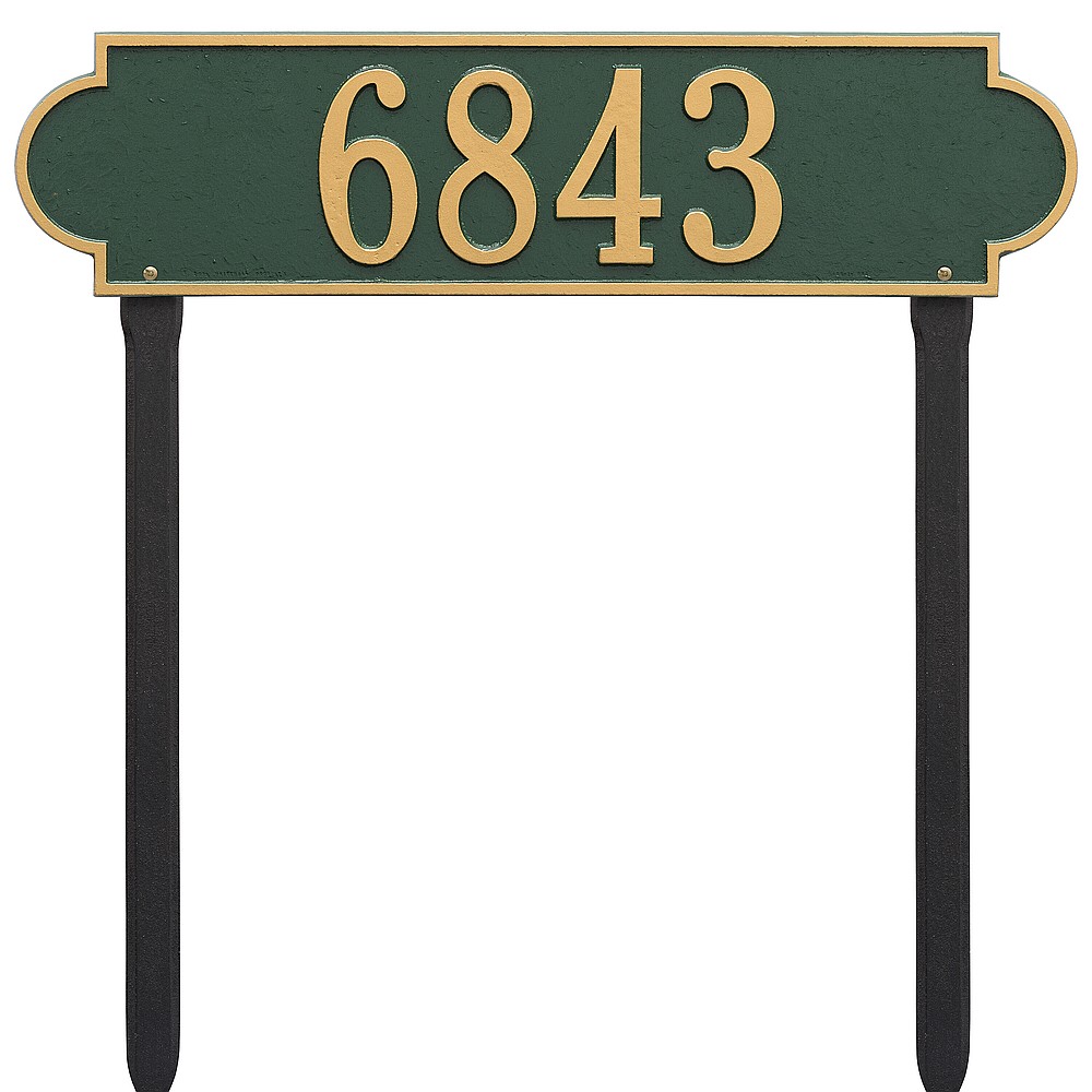 Dimensions (L x W x H): 25 x 6 x .375 The Whitehall Richmond Horizontal personalized plaque is a great way to update your address numbers and add curb appeal. The Richmond plaque features a traditional style with arched end caps. Every Whitehall plaque is proudly hand crafted in the USA. Personalization is permanently cast into the sign. Manufactured from cast, high-density aluminum alloy and protected by our exclusive Alumi-Shield all weather coatings. Alumi-Shield All Weather Coating: A Whitehall Exclusive Alumi-Shield – Protects against the harshest weather and environmental elements. Extends the product life and maintains the look and function. Made in the USA.
