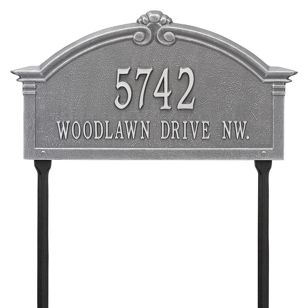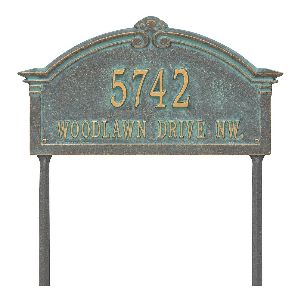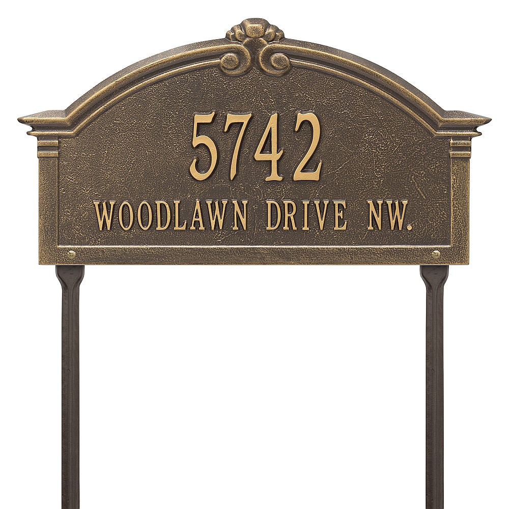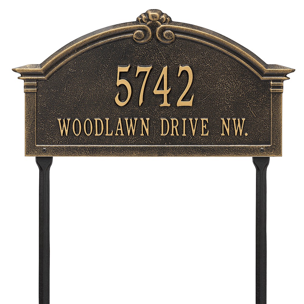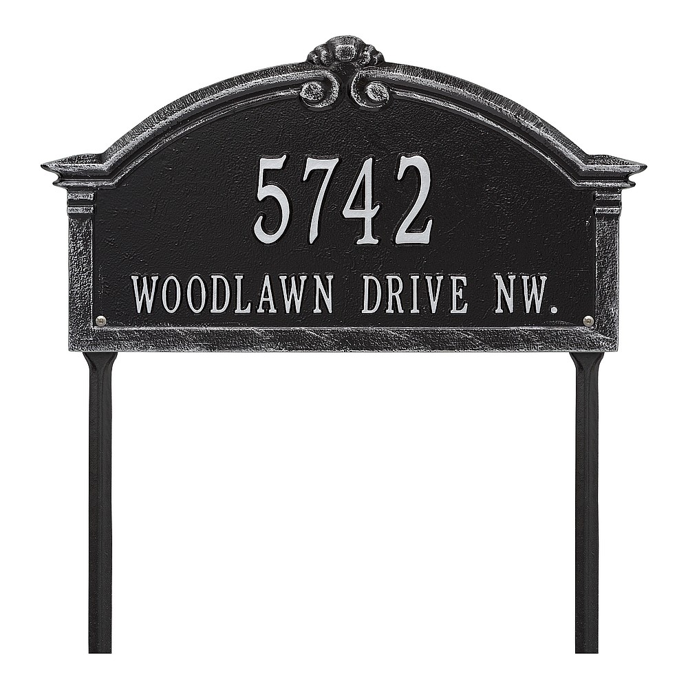 Dimensions (L x W x H): 18.75 x 10.25 x .4 The Whitehall Roselyn Arch personalized plaque adds instant curb appeal to your home address numbers. A detailed scroll border frames the edge of the Roselyn plaques classic arch design. Every Whitehall plaque is proudly hand crafted in the USA. Personalization is permanently cast into the sign. Manufactured from cast, high-density aluminum alloy and protected by our exclusive Alumi-Shield all weather coatings. Alumi-Shield All Weather Coating: A Whitehall Exclusive Alumi-Shield – Protects against the harshest weather and environmental elements. Extends the product life and maintains the look and function. Made in the USA.
