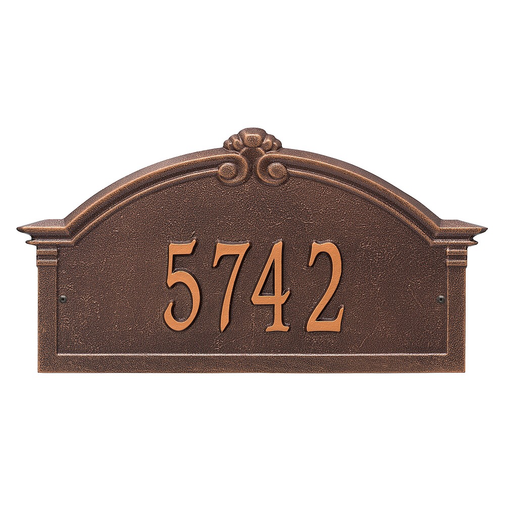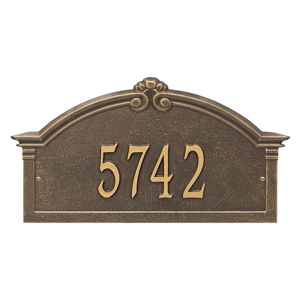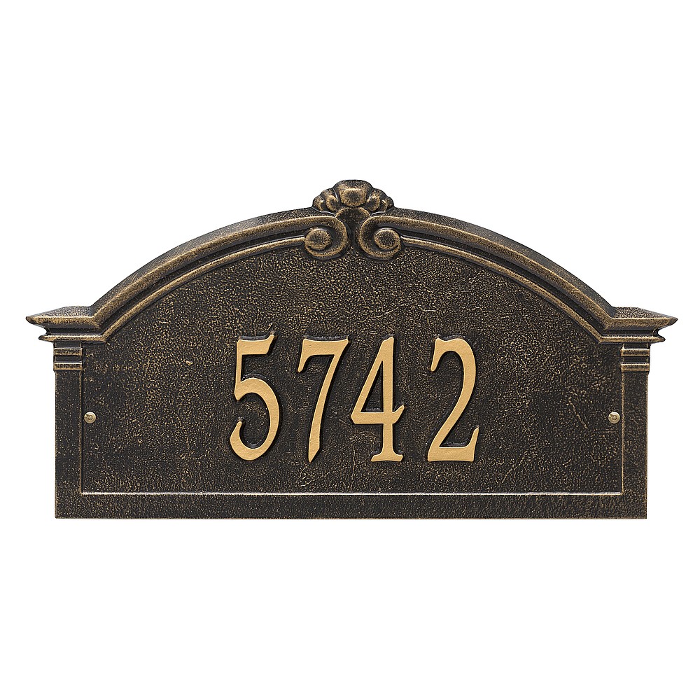 Dimensions (L x W x H): 18.75 x 10.25 x .4 The Whitehall Roselyn Arch personalized plaque adds instant curb appeal to your home address numbers. A detailed scroll border frames the edge of the Roselyn plaques classic arch design. Every Whitehall plaque is proudly hand crafted in the USA. Personalization is permanently cast into the sign. Manufactured from cast, high-density aluminum alloy and protected by our exclusive Alumi-Shield all weather coatings. Alumi-Shield All Weather Coating: A Whitehall Exclusive Alumi-Shield – Protects against the harshest weather and environmental elements. Extends the product life and maintains the look and function. Made in the USA.