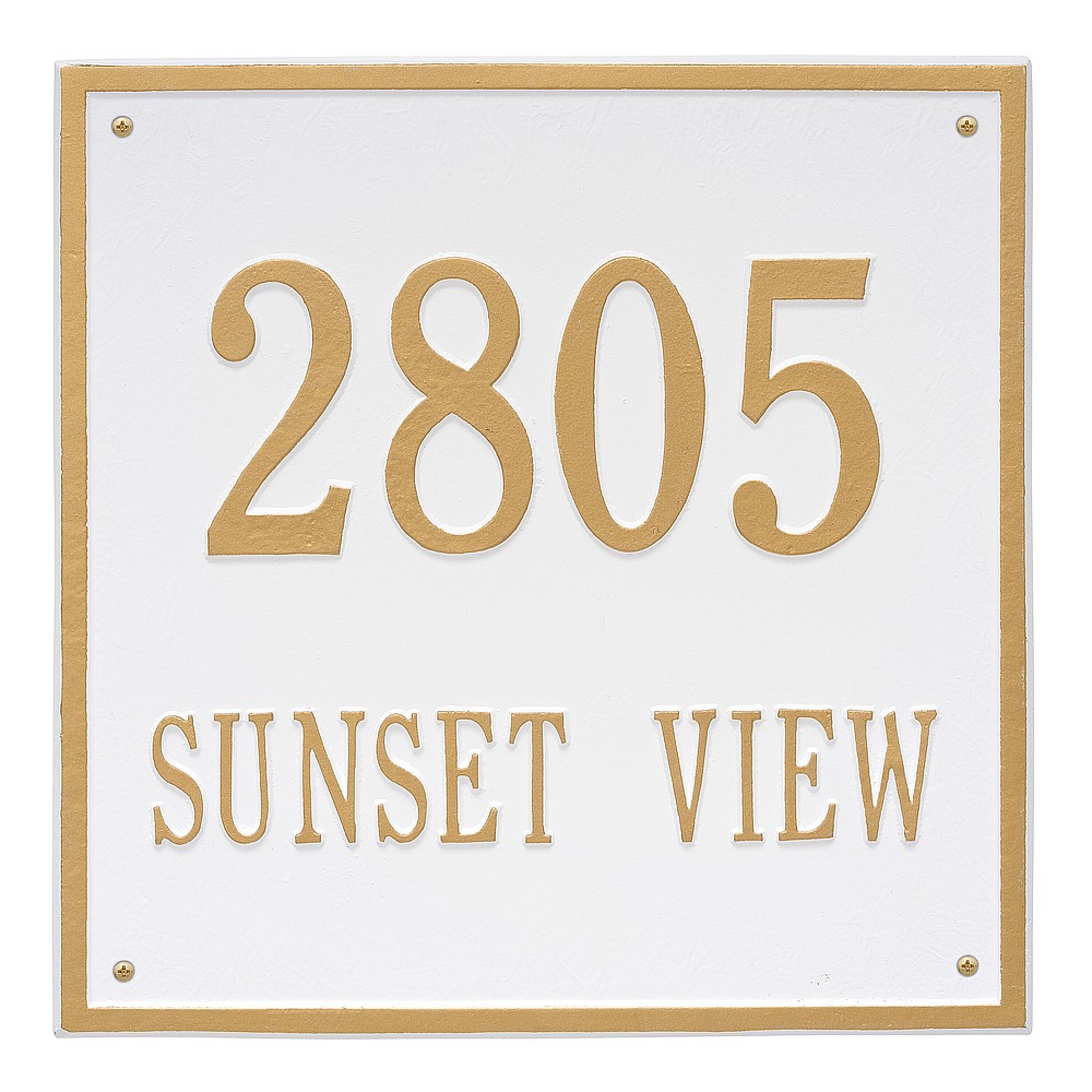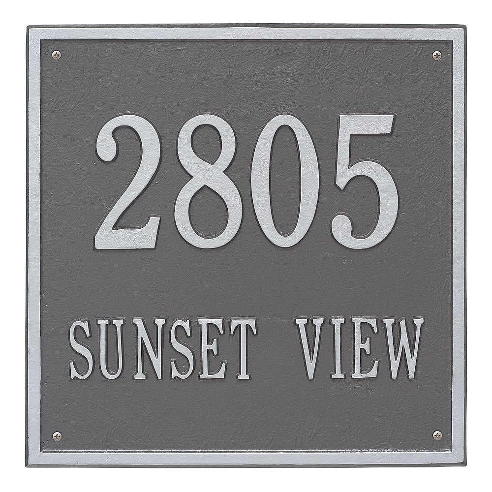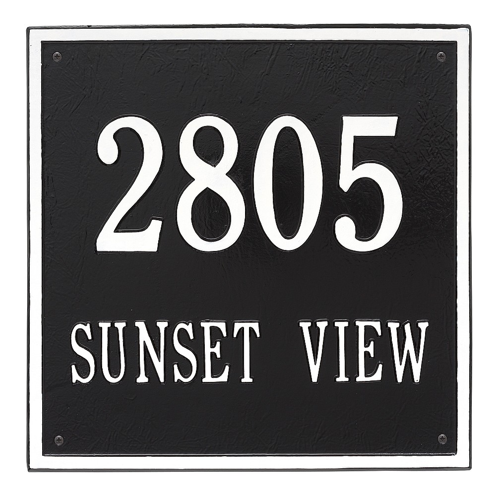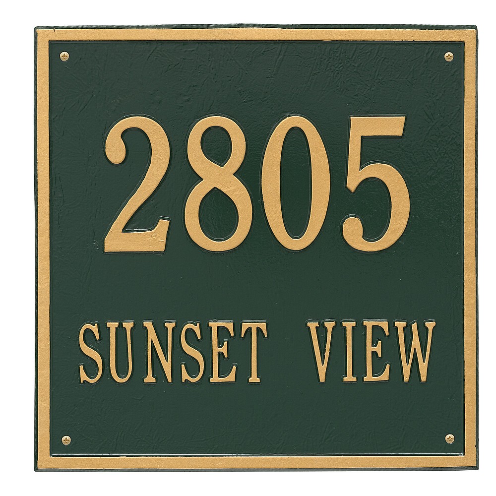 Dimensions (L x W x H): 15 x 15 x .375 The Whitehall Square personalized plaque adds instant curb appeal to your home address numbers. The traditional style of the Square plaque compliments any home exterior. Every Whitehall plaque is proudly hand crafted in the USA. Personalization is permanently cast into the sign. Manufactured from cast, high-density aluminum alloy and protected by our exclusive Alumi-Shield all weather coatings. Alumi-Shield All Weather Coating: A Whitehall Exclusive Alumi-Shield – Protects against the harshest weather and environmental elements. Extends the product life and maintains the look and function. Made in the USA.