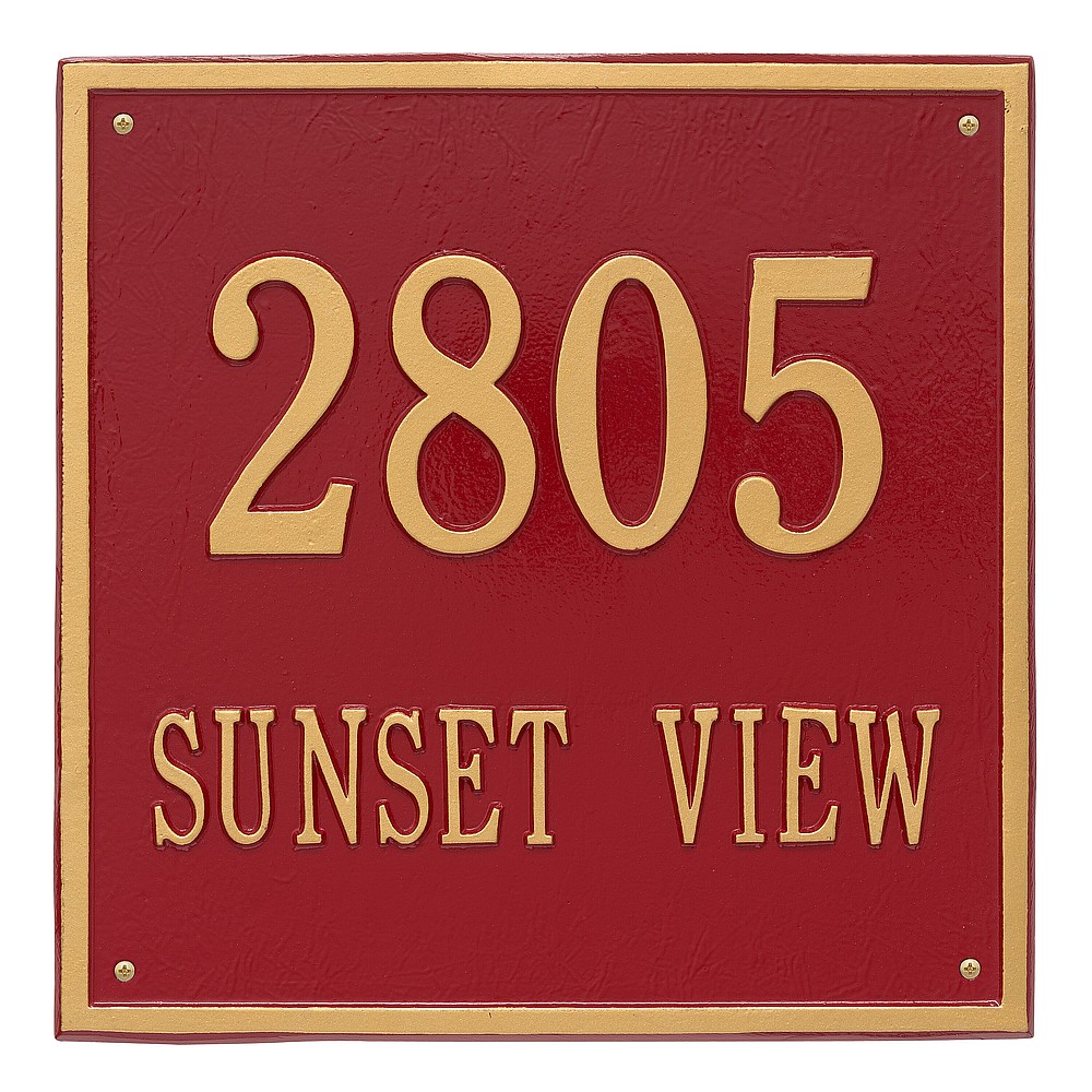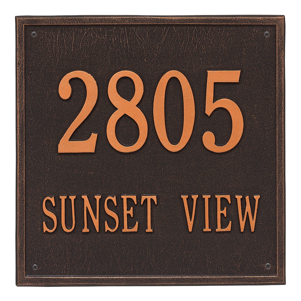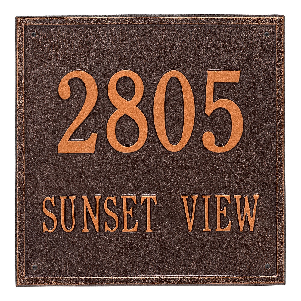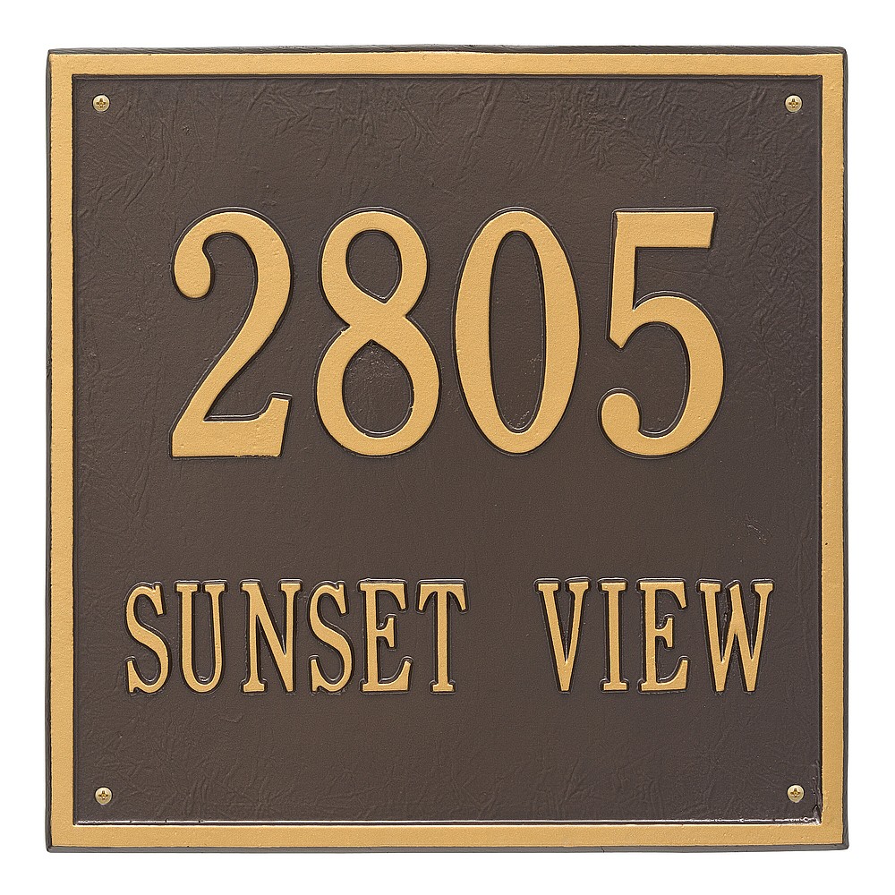 Dimensions (L x W x H): 15 x 15 x .375 The Whitehall Square personalized plaque adds instant curb appeal to your home address numbers. The traditional style of the Square plaque compliments any home exterior. Every Whitehall plaque is proudly hand crafted in the USA. Personalization is permanently cast into the sign. Manufactured from cast, high-density aluminum alloy and protected by our exclusive Alumi-Shield all weather coatings. Alumi-Shield All Weather Coating: A Whitehall Exclusive Alumi-Shield – Protects against the harshest weather and environmental elements. Extends the product life and maintains the look and function. Made in the USA.