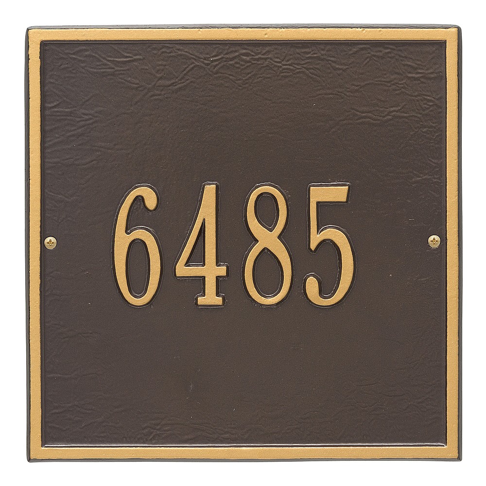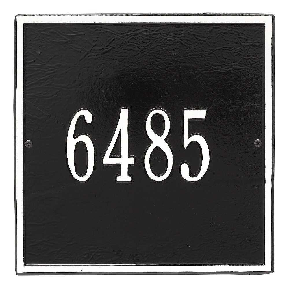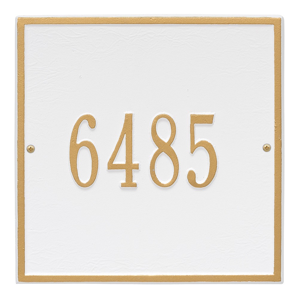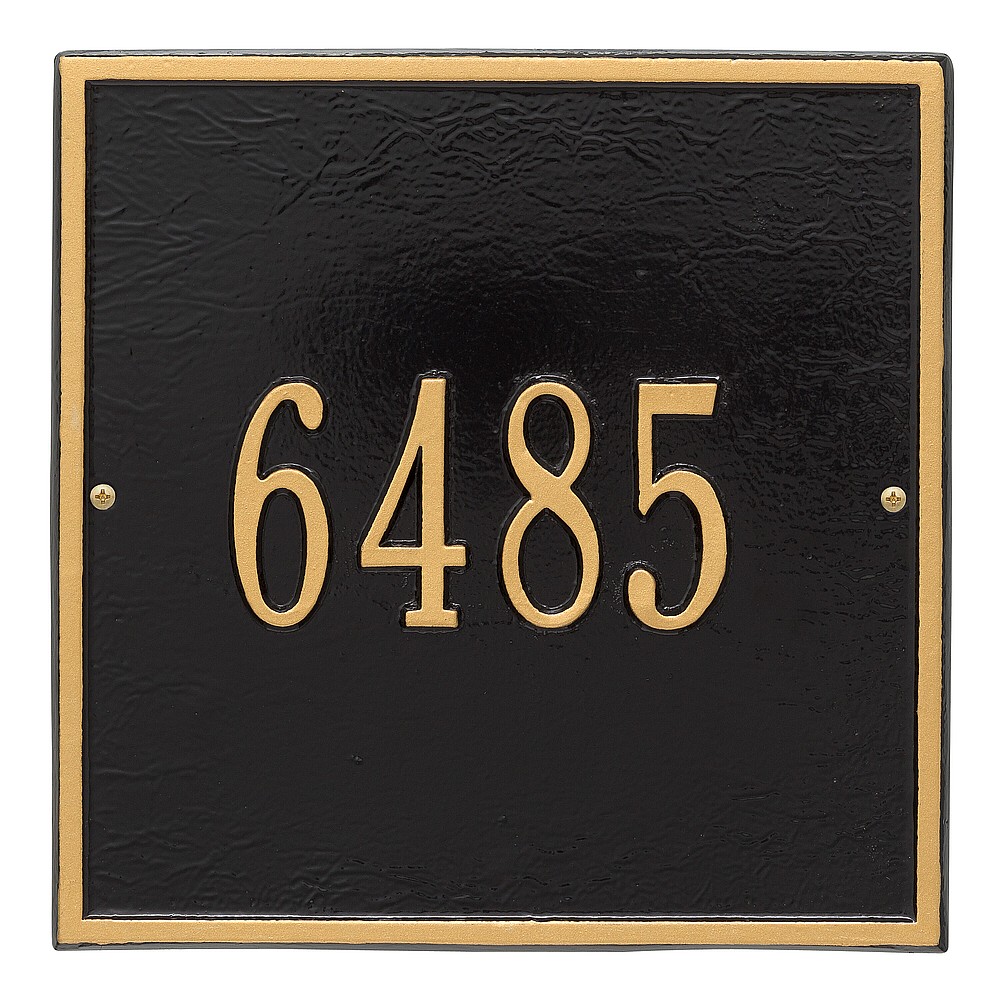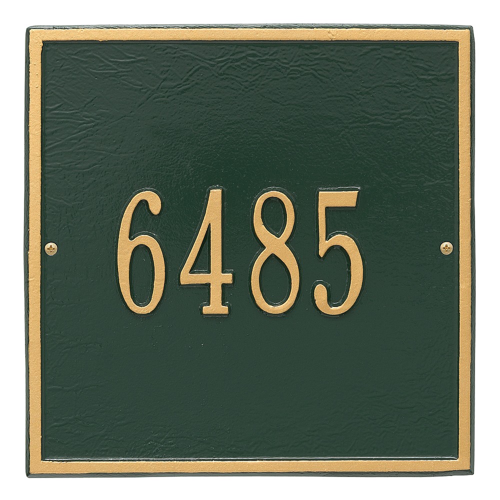 Dimensions (L x W x H): 11 x 11 x .375 The Whitehall Square personalized plaque adds instant curb appeal to your home address numbers. The traditional style of the Square plaque compliments any home exterior. Every Whitehall plaque is proudly hand crafted in the USA. Personalization is permanently cast into the sign. Manufactured from cast, high-density aluminum alloy and protected by our exclusive Alumi-Shield all weather coatings. Alumi-Shield All Weather Coating: A Whitehall Exclusive Alumi-Shield – Protects against the harshest weather and environmental elements. Extends the product life and maintains the look and function. Made in the USA.