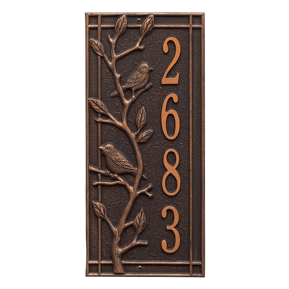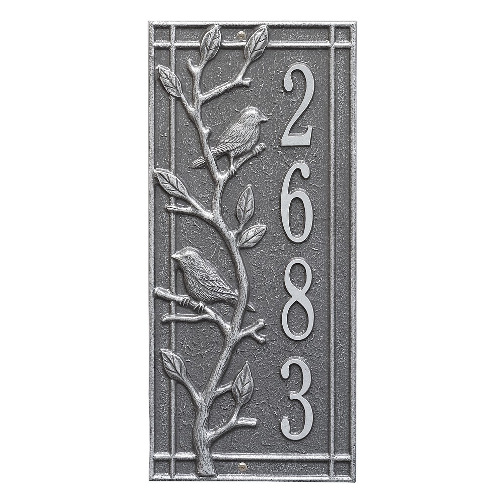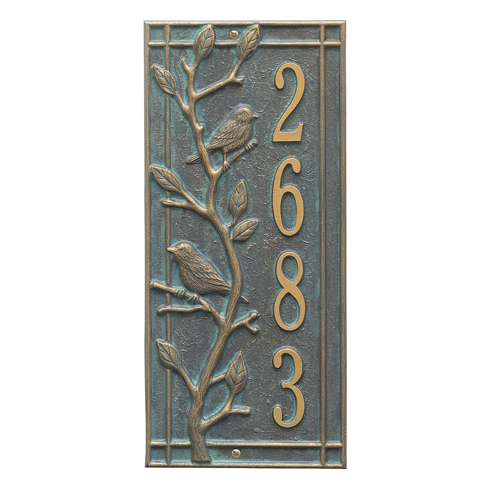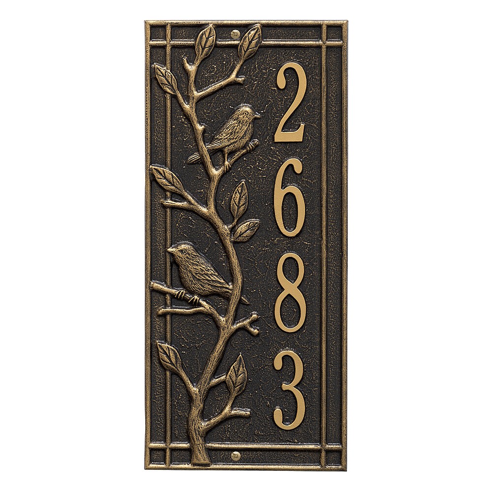 Dimensions (L x W x H): 7.5 x 16.5 x .375 The Whitehall Woodridge Bird personalized plaque is a great way to add instant curb appeal. The Woodridge Bird plaque features a traditional style shadow box border accented by bird and branch details. Every Whitehall plaque is proudly hand crafted in the USA. Personalization is permanently cast into the sign. Manufactured from cast, high-density aluminum alloy and protected by our exclusive Alumi-Shield all weather coatings. Alumi-Shield All Weather Coating: A Whitehall Exclusive Alumi-Shield – Protects against the harshest weather and environmental elements. Extends the product life and maintains the look and function. Made in the USA.