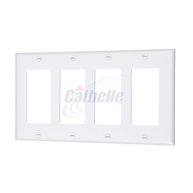 The 4-Gang Thermoset Decora /GFCI Device wall plate features a smooth face and rounded edges which resist dust accumulation. This wall plate is also photo electrically colour-matched to other Leviton Decora devices and is designed for high dielectric strength and arc resistance. Available in ivory, black, gray, brown, and almond.
