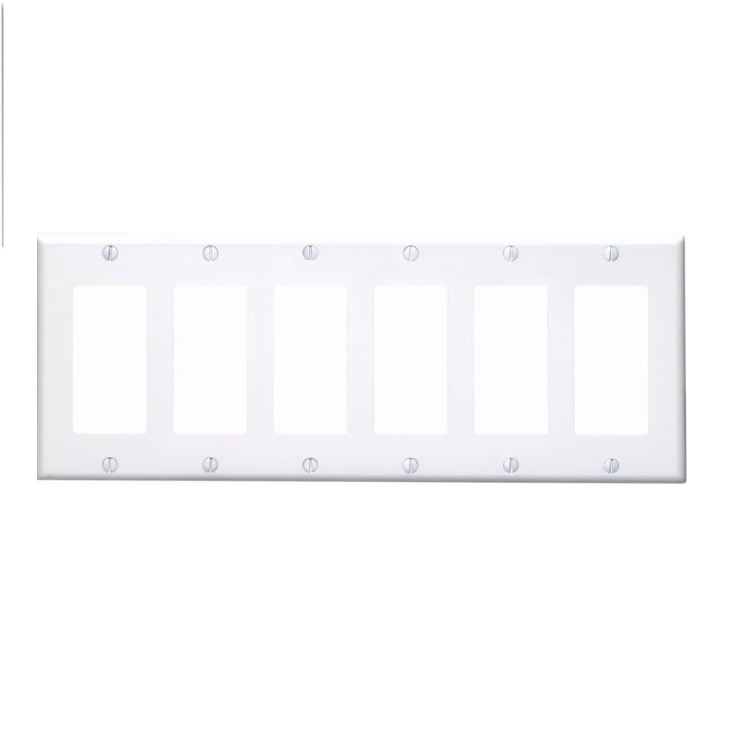Leviton Decora Designer Wallplates — available in a wide spectrum of colors and styles — can add subtle elegance to any home. Sleek, versatile and convenient, they also come in a midway size that gives even greater coverage, and can hide unsightly wall surface irregularities. All Leviton Decorative Wallplates can stand up to heavy use while coordinating perfectly with paint or wall coverings. Think of them as the finishing touch to giving a home its signature look. 6-Gang Decora/GFCI Device Decora Wallplate, Standard Size, Thermoset, Device Mount, White.