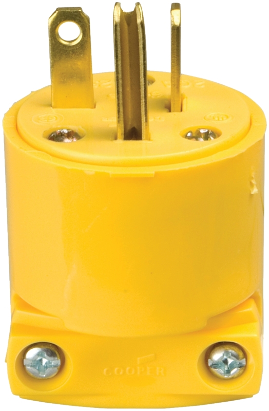 Solid brass plug blades are firmly embedded in body. Resists chemical attack and is less brittle in extremely low temperatures. With terminal screw clamps. Combination Slot/Phillips head mounting and terminal screws for installation flexibility (Slot/Robertson screws in Canada where available). Terminal screws backed out, ready for wiring. Yellow color. Meets all UL 498 requirements.