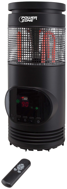 360 deg Infrared quartz tower heater with remote control and LED digital display with easy-to-use pushbutton control. ECO/1000/1500 W heat settings. Programmable timer 1 to 12 hr three infrared quartz heating elements. Standard USB port charges mobile or other devices. Automatic overheat protection system and safety tip-over switch.