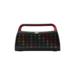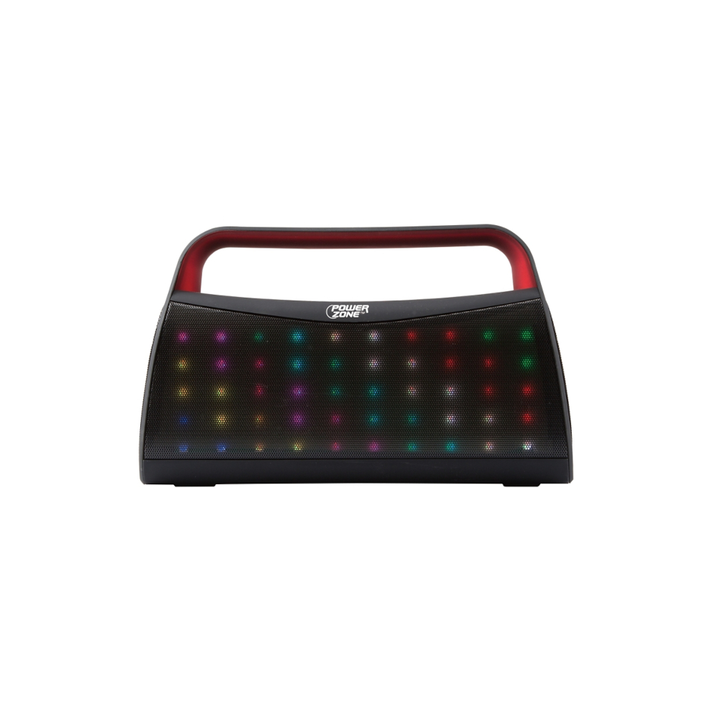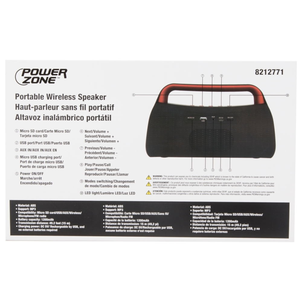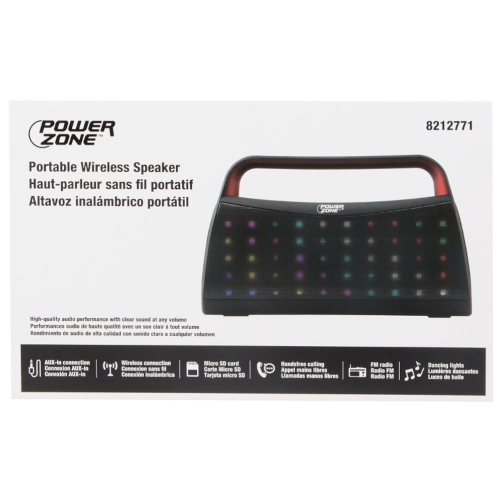 Portable wireless speaker. Made of ABS material. Supports MP3. Compatible with Micro SD card/USB/AUX/wireless microphone/FM radio. 1200mAh battery. 49.2 ft (15m) transmit distance. 5W x 2 speakers. DC 5V charging power/rechargeable by USB, and no external batteries required. Includes dancing LED Lights. Black color.