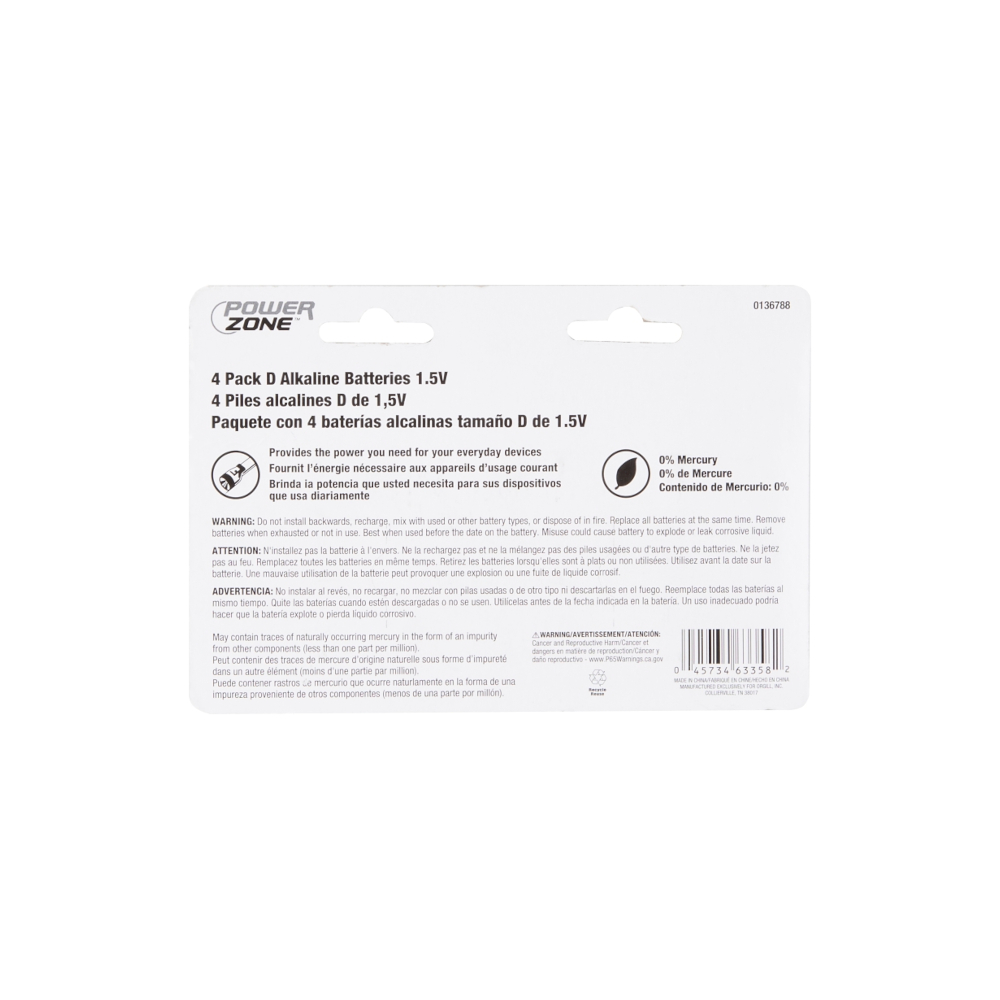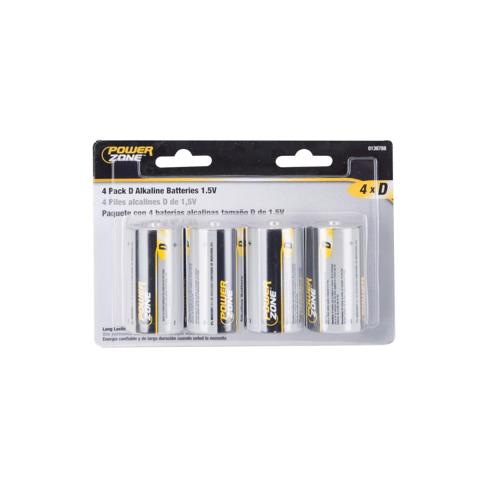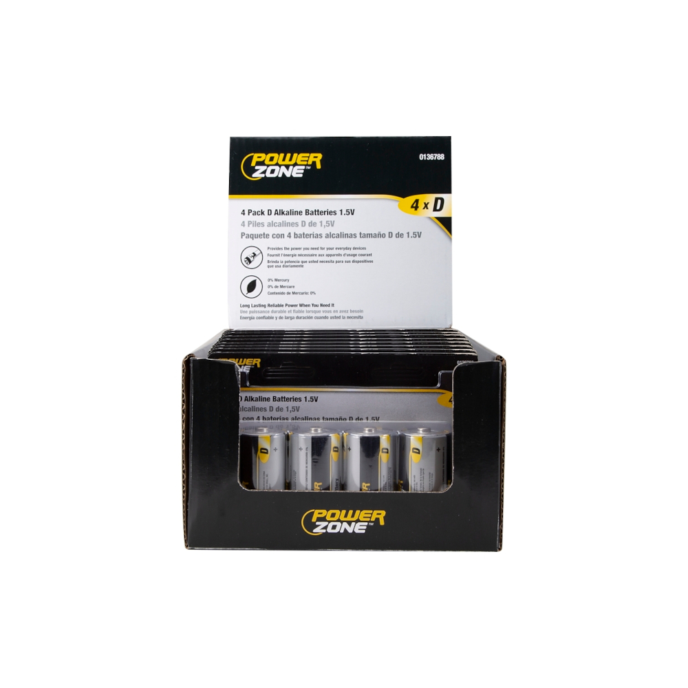 PowerZone LR20-4P-DB Battery, 1.5 V Battery, D Battery, Zinc, Manganese Dioxide, and Potassium Hydroxide
