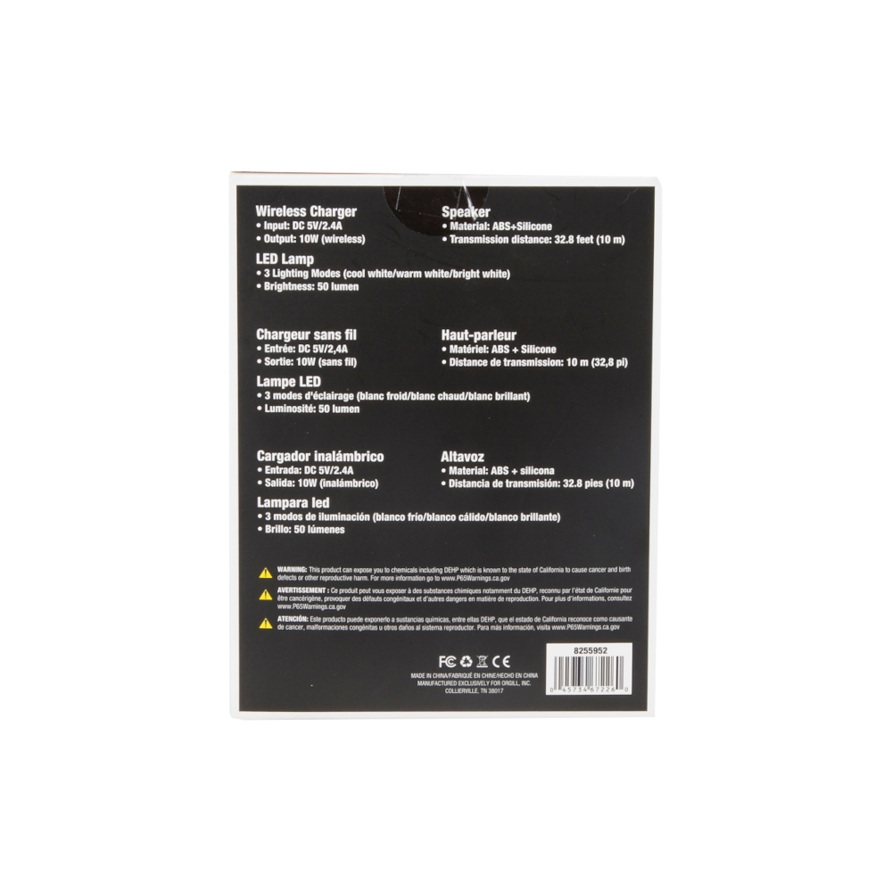 3 in 1 Speaker with wireless phone charger and LED lamp. Made of ABS + silicone material. Supports MP3. 32.8 ft (10m) transmit distance. Features LED Lamp with: 3 lighting modes (cool white/warm white/bright white), 50 lumens, wireless charger and flexible neck. 3W (speaker)/10W (wireless) output. Black color.