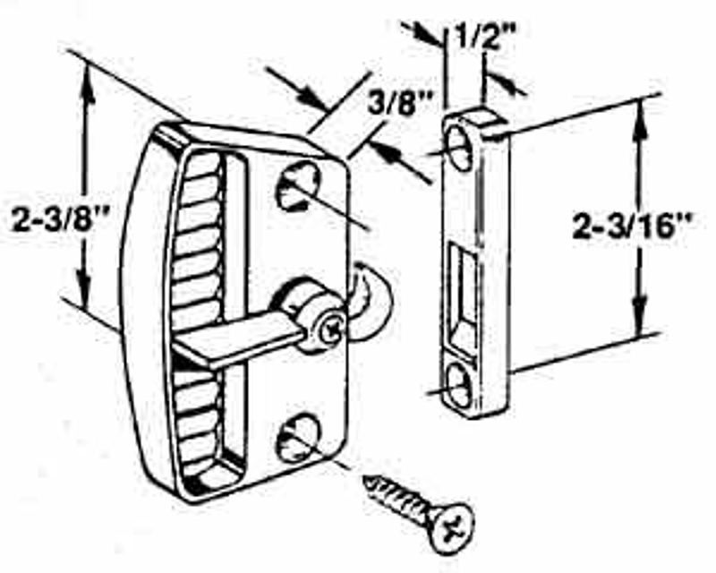 This handle and latch is a non-handed inside surface mounted handle set only. It is made of chromed die-cast metal with 2-3/8 in mounting holes. The latch and lever rotate to engage the supplied surface mounted keeper. Used by many patio door manufacturers. Excellent as a primary as or a secondary screen door security latch.
