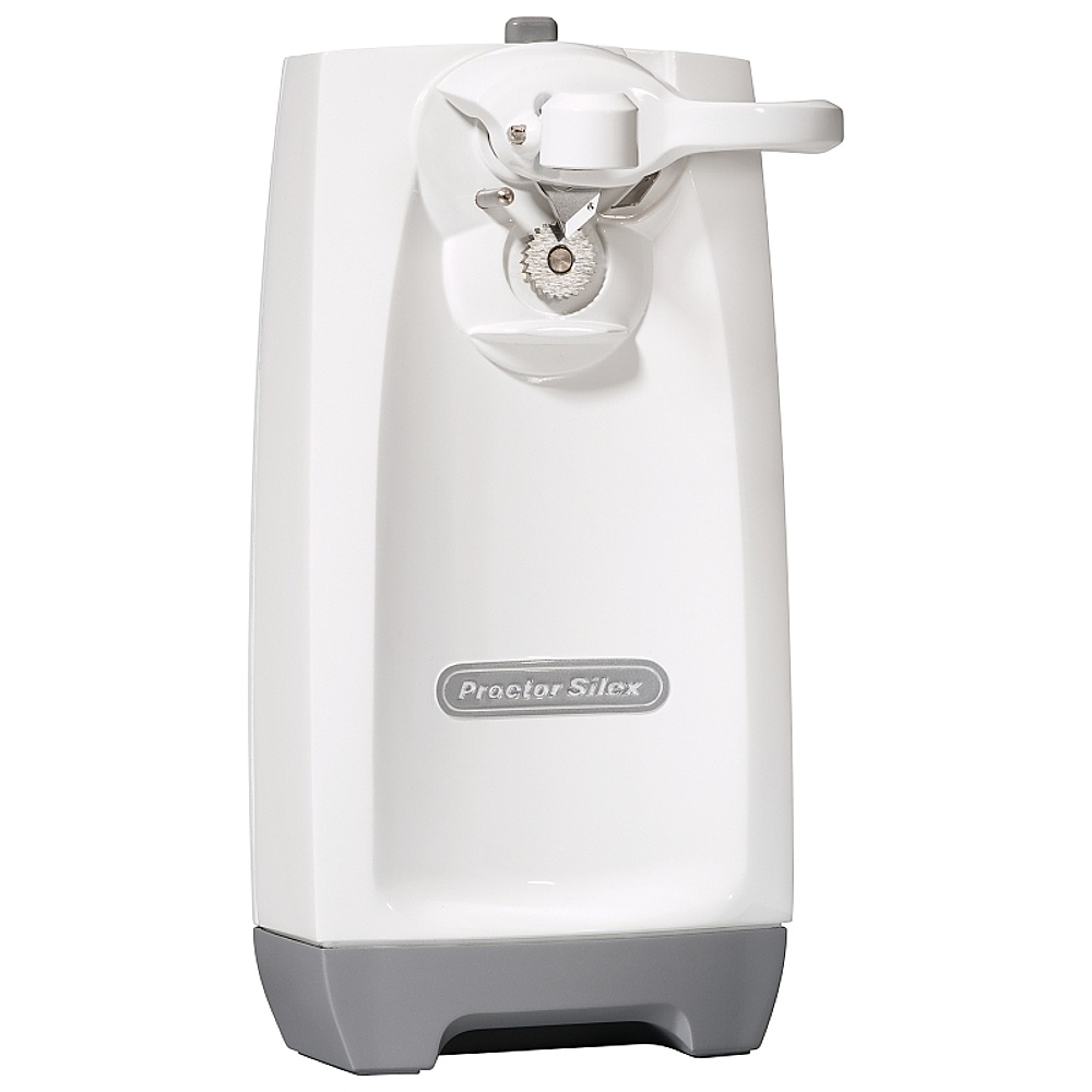 Proctor Silex Can Opener with Knife Sharpener, Power Source: Electric, Power Supply: Cord, Detachable Lever Handle, Plastic, White, Dimensions: 5 in x 4.88 in x 10 in