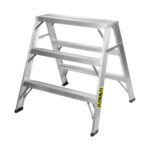 This Featherlite 3′ aluminum sawhorse has a 300lb load capacity. This sawhorse combines two essential tools to create a lightweight wide surface and a support tool for sawing and other tasks. This sawhorse is equipped with angled aluminum slip-resistant rubber feet, heavy gauge steel hinges, heavy duty gusset bracing, and double-rivet step construction.