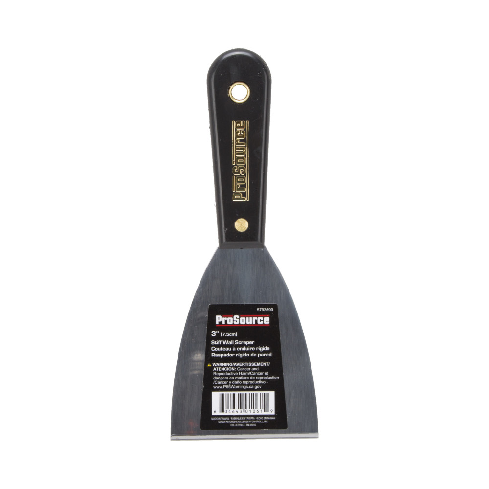The ProSource wall scraper has a heat-treated, precision ground, mirror finished, full tang construction, high carbon steel blade. Its lacquered coated with a brass rivet nylon handle.