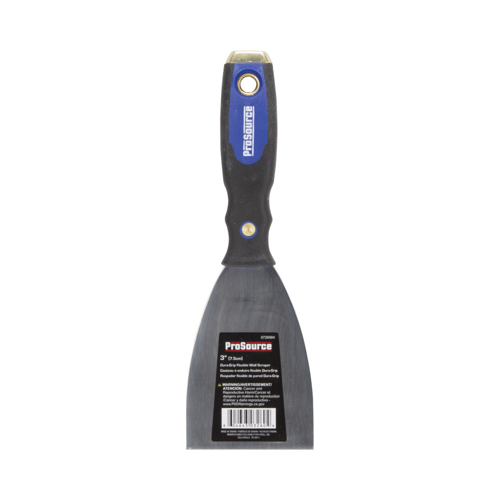The ProSource wall scraper is made from full tang construction and high-carbon steel with a mirror finished blade. The ergo-engineered soft-grip handle absorbs shock and reduces worker fatigue and the brass rivet holds the blade more securely inside the handle.