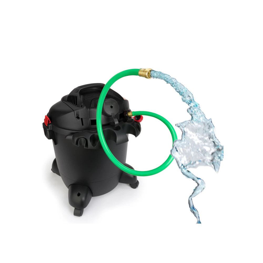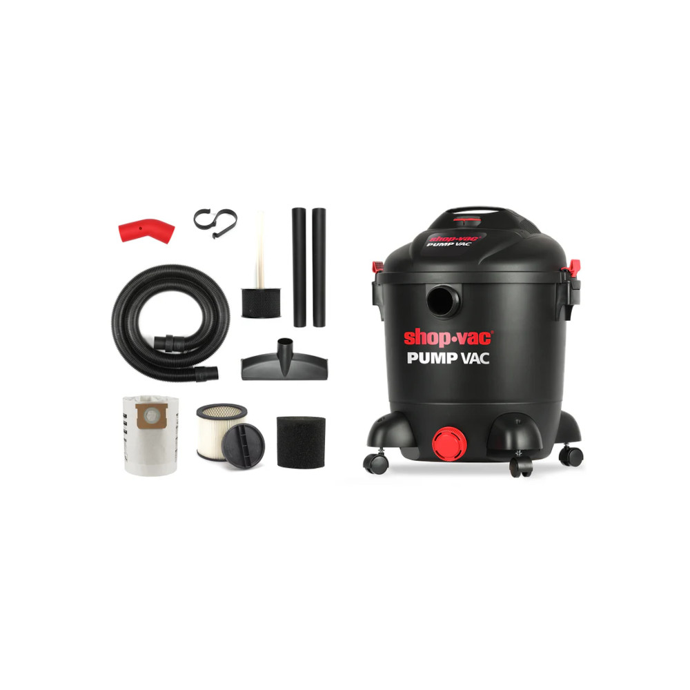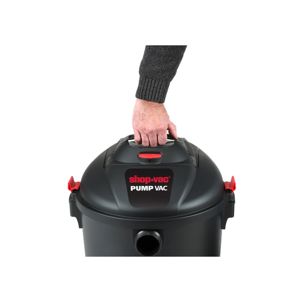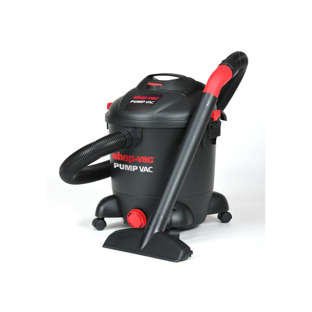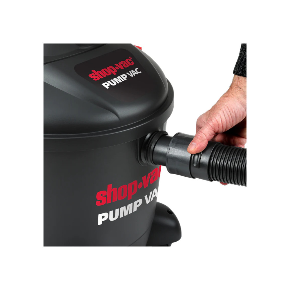 The Shop-Vac Pump Vac allows you to pump liquid out of the tank using a standard garden hose (not included). The Pump Vac is constructed of durable plastic and it features a tank drain, onboard accessory storage, a blower feature and a built-in water pump.