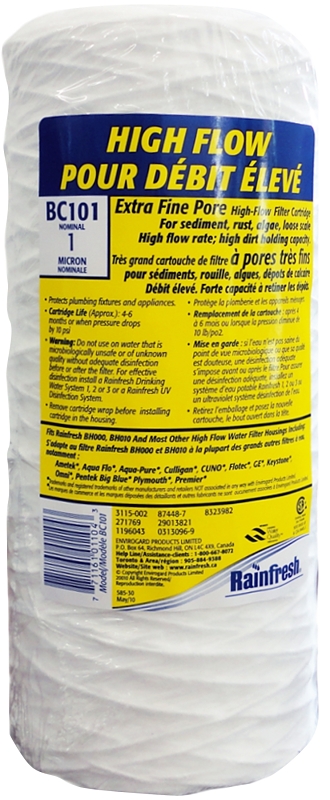 Rainfresh BC Series high flow string wound filter cartridges are manufactured using 100% food-grade virgin polypropylene. The BC filter cartridges are nominally-rated and exhibit excellent contaminant removal efficiency at the rated micron size. Because of their large surface area and volume, they also exhibit excellent flow characteristics, making these filters an excellent choice for any high-flow water filtration application such as whole home sediment filtration and light commercial applications.