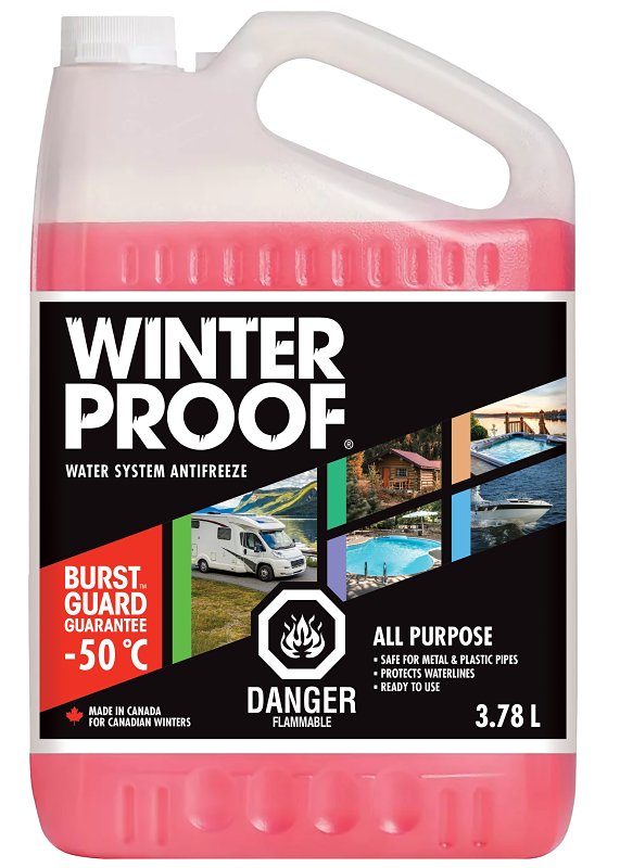 WinterProofâ„¢ water system antifreeze provides superior protection for pipes and waterlines during winter’s worst conditions. With the BurstGuardâ„¢ -50 deg C guarantee, it is ideal for winterizing cottages, RV’s, swimming pools, boats and septic systems.