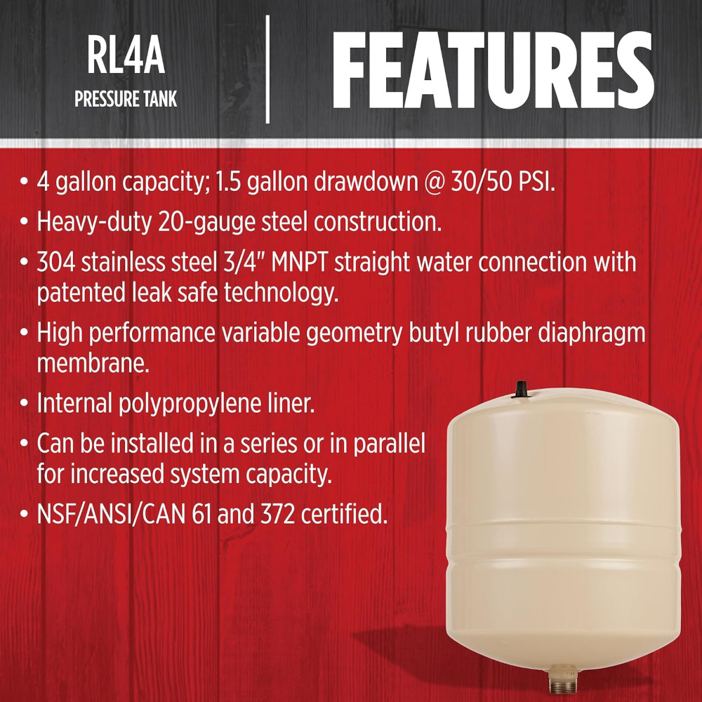 Red Lion RL Pre-Charged Pressure Tank, 3/4 in Connection, MNPT Connection, 4.5 gal, 14-1/2 in D, 11 in Dia, Steel