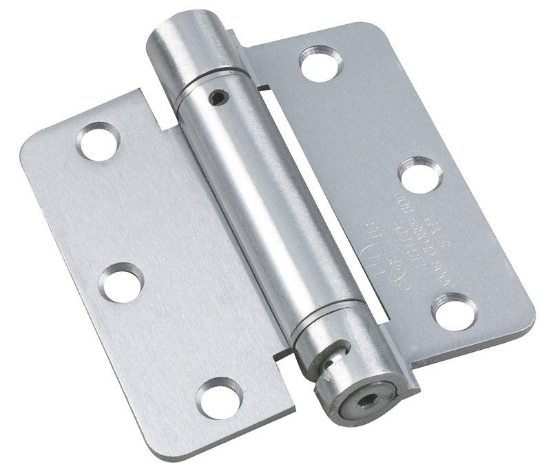 Onward Spring Hinge, 30 lb Weight, Door Leaf Height: 88.8 mm, Door Leaf Width: 44.5 mm, Door Leaf Thickness: 2.7 mm, Frame Leaf Height: 88.8 mm, Frame Leaf Width: 44.5 mm, Frame Leaf Thickness: 2.7 mm, Number of Knuckles: 3, Pin Diameter: 18 mm, Number of Mounting Holes: 6, Mounting Hole Diameter: 7.2 mm Inside, 10.2 mm Outside, Hole Spacing: 35.4 mm, Steel, Chrome, Dimensions: 3.5 in L x 1.75 in W, Includes: (6) #10 x 1 in Wood Screws, (6) #10-24 x 1/2 in Machine Screws