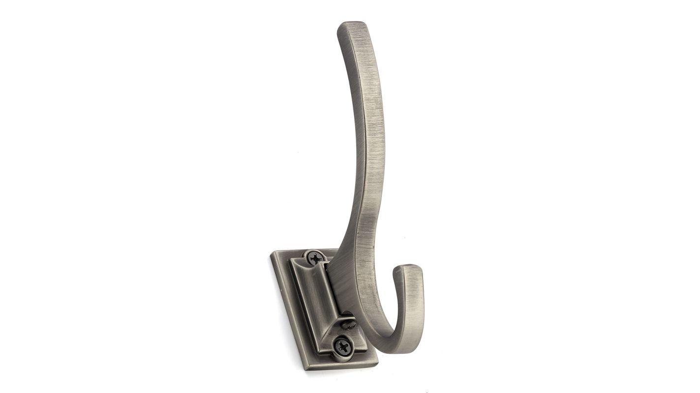 Features: Designed to hold a wide variety of items such as coats hats back packs scarves purses and bags Beautifully finished to add an updated and refined look to your home Contemporary design gives a sleek and simple style Solid metal construction adds durability and a high-end feel All mounting hardware included for installation Specifications: Height: 4.9968 Width: 1.2673 Projection: 3.0133 Number of Hooks: 2 Material: MetalAvailable Finishes: RH1233021140: Chrome RH1233021143 (This Model): Antique Nickel RH1233021195: Brushed Nickel RH1233021BORB: Brushed Oil-Rubbed Bronze.