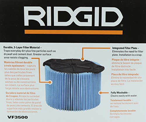 The 3-Layer Fine Dust Filter for 3 to 4 1/2 Gallon Wet/Dry Vacuums features 3 layers of filtering material that captures particles too small to be seen by the naked eye. The pleated design offers a large surface area to trap superfine dust and dirt. The filter fits all RIDGID wet dry vacs 3 to 4.5 gallons. With its patented QwikLock feature the filter simply snaps on or off the vacuum for easy cleaning.