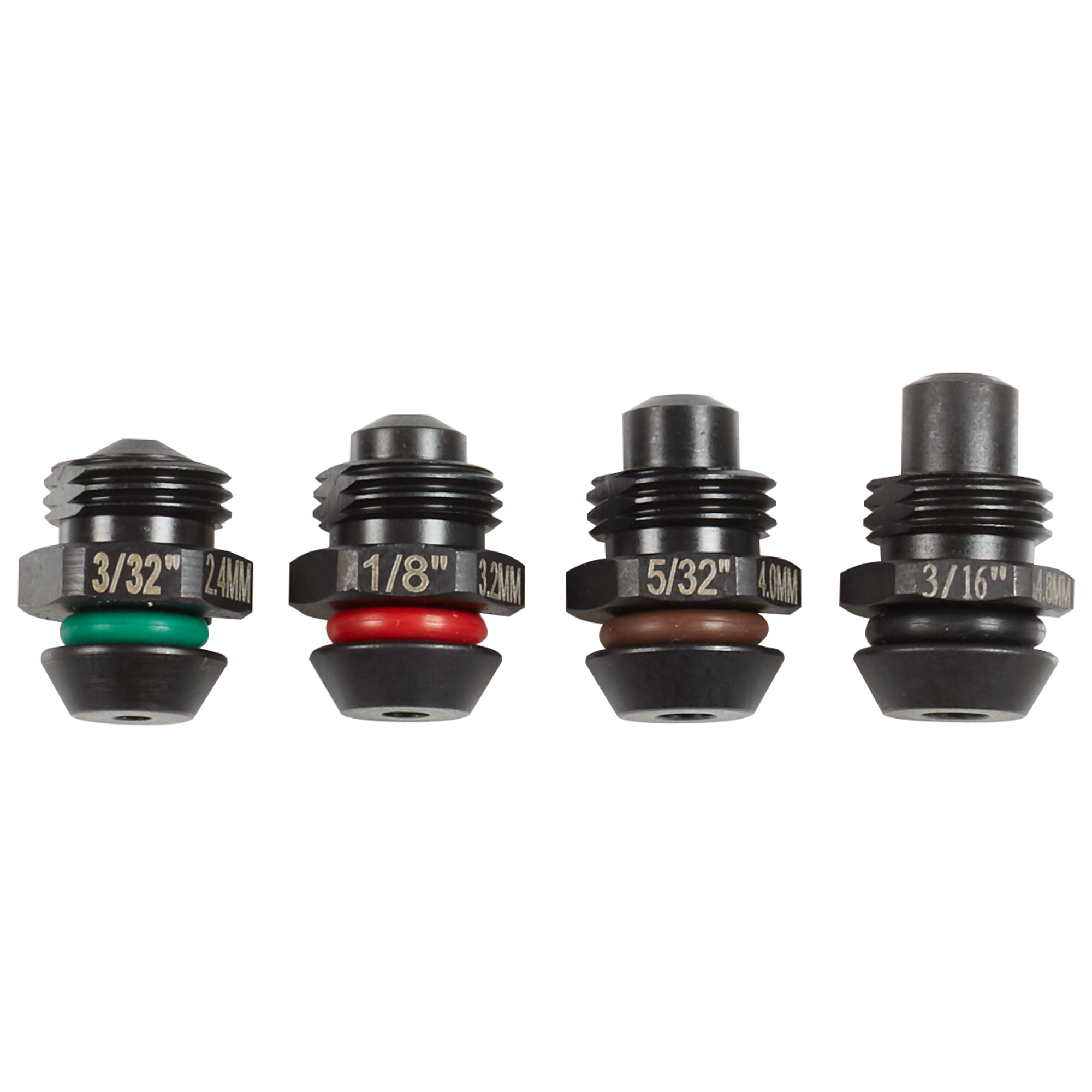 The M12 rivet tool mandrel retention nose pieces 4 pk allows rivets inserted to stay in the tool at any orientation. Each nose piece is laser etched with its diameter in English units as well as metric. Each nose piece is also color coordinated to allow quick identification when being exchanged. Compatible with the 2550 M12 rivet tool.