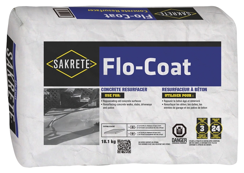 Rejuvenate old concrete surfaces. Use Sakrete Flo-Coat, a polymer-modified, flowable, resurfacing material, as an alternative to expensive concrete replacement. Go with Sakrete, the Pro’s choice since 1936.