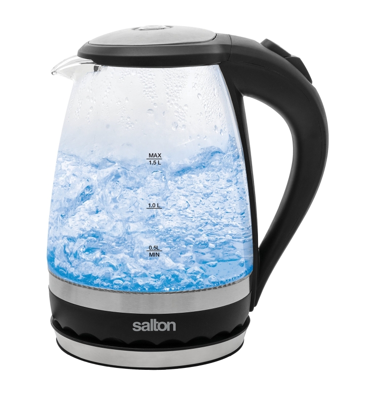 Add a little light to your water with a vibrant blue illumination. The Salton Cordless Electric Glass Kettle is the perfect small-space solution at a compact 1.5 L capacity. Elegantly crafted of thermal shock resistant glass and brushed stainless steel make this kettle the safest and most economical way to boil water. The hinged lid and concealed heating element permit fast and easy cleaning while the convenient water level markings on both sides of the kettle and 360 deg base allow for easy right or left hand use. The handy cord wrap will eliminate clutter from your counter and the sleek design will illuminate the look of your kitchen.