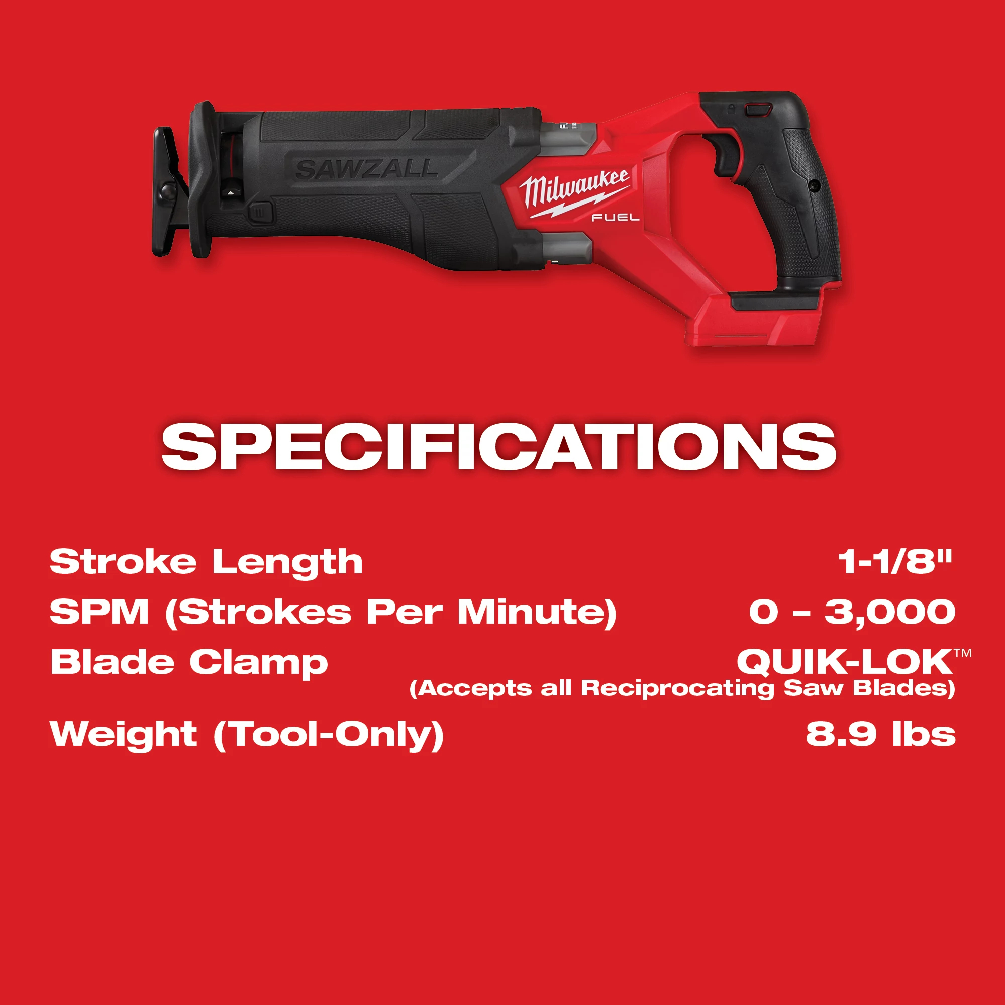 The MILWAUKEE® M18 FUELâ„¢ SAWZALL® Recip Saw is the next generation of legendary performance and durability, designed for the toughest applications on the job site. The M18 FUELâ„¢ SAWZALL® is the fastest cutting reciprocating saw in its class and leverages a POWERSTATEâ„¢ Brushless Motor to provide 3,000 SPM and a 1-1/4″ stroke length for faster material removal. REDLINKâ„¢ PLUS electronics ensure maximum performance under stress as well as protection from overloading, overheating, and over-discharging. The M18â„¢ REDLITHIUMâ„¢ XC5.0 Battery Pack (not included) delivers up to 2.5X runtime and provides more work per charge and more work over the life of the pack than competitive batteries. The M18 FUELâ„¢ SAWZALL® Recip Saw is designed to perform in the most demanding applications and is the most durable Milwaukee cordless reciprocating saw yet. A wear-resistant blade change, anti-corrosion blade clamp, and metal reinforced battery rails provide longer component life and stand up to the toughest jobsite conditions. The M18 FUELâ„¢ SAWZALL® Recip Saw is lighter weight than the previous generation and features an adjustable shoe, integrated LED light, and a hanging hook for convenient storage on the job.