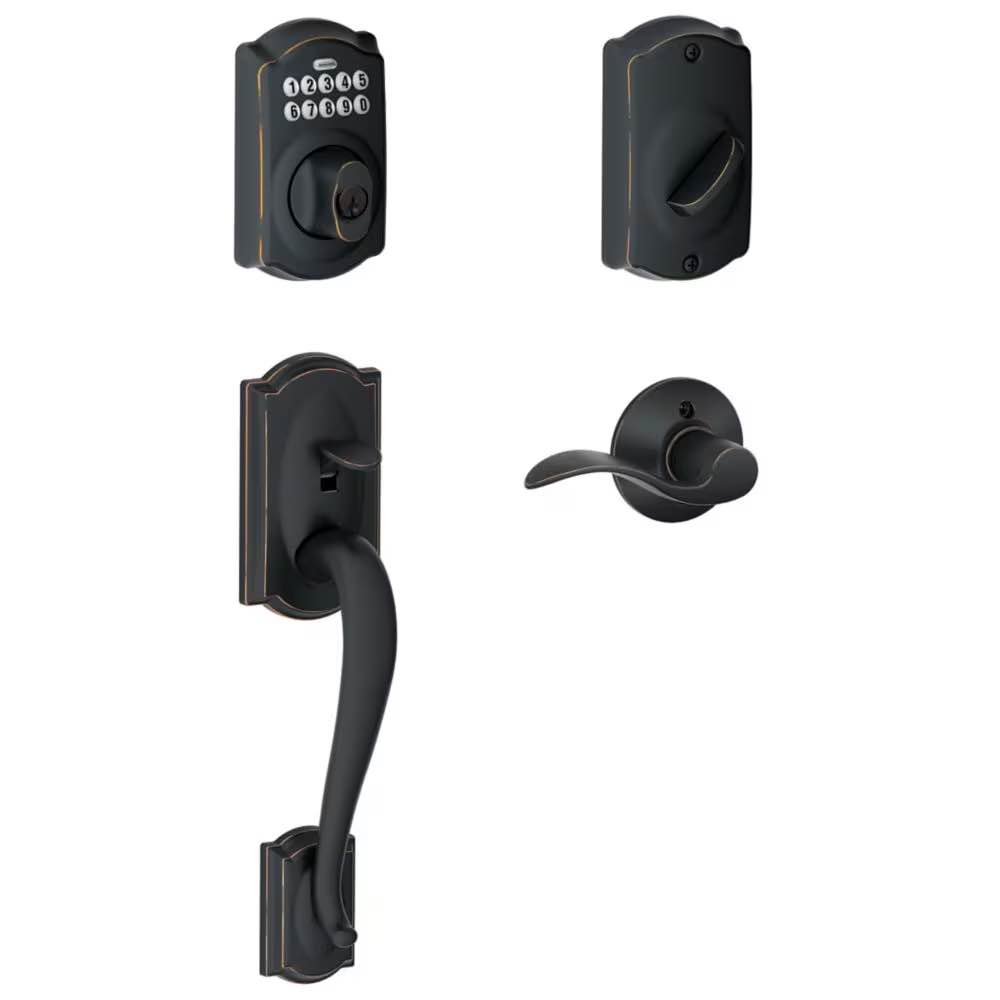 Schlage Camelot Trim Electronic Keyless Deadbolt and Exterior Door Handleset with Accent Door Lever – Aged Bronze