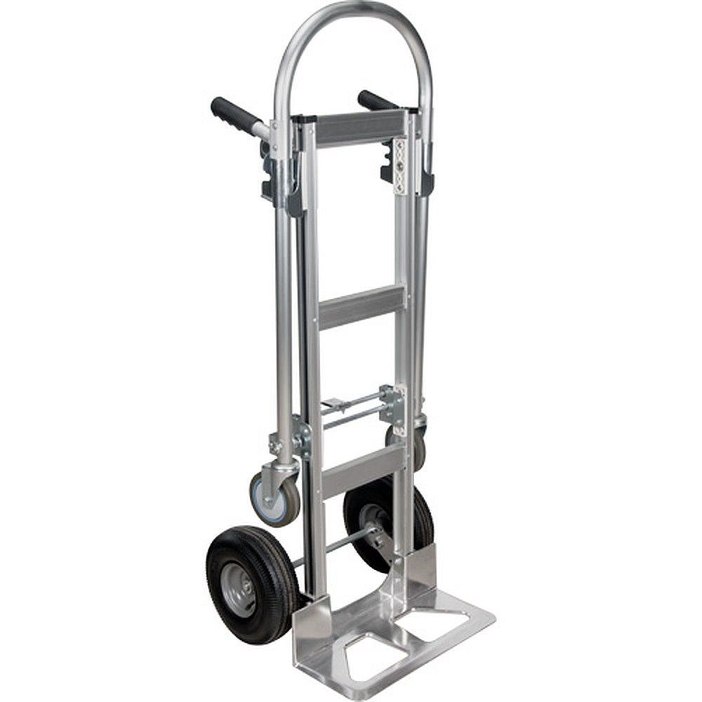 Converts easily from a 2-wheel hand truck to a 4-wheel platform truck, Lightweight aluminum construction, 5″ polyurethane casters and 10″ pneumatic wheels, Shipped assembled