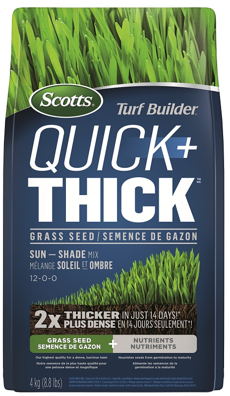 Even if your yard is the fickle sort with varying degrees of sun and shade, you can grow a dense and luscious lawn fast. Scotts® Turf Builder® Quick + Thick™ grass seed sun and shade mix 12-0-0 grows grass 2X thicker, in just 14 days. Our exclusive mix contains our highest quality grass seed plus a special blend of slow-release fertilizers. So, seed not only gets a quick start, it grows into thick, green grass that lasts. 99.99% weed-free grass seed made just for full sun and partial shade. Ideal for overseeding existing lawns. Great for establishing a new lawn on bare soil.