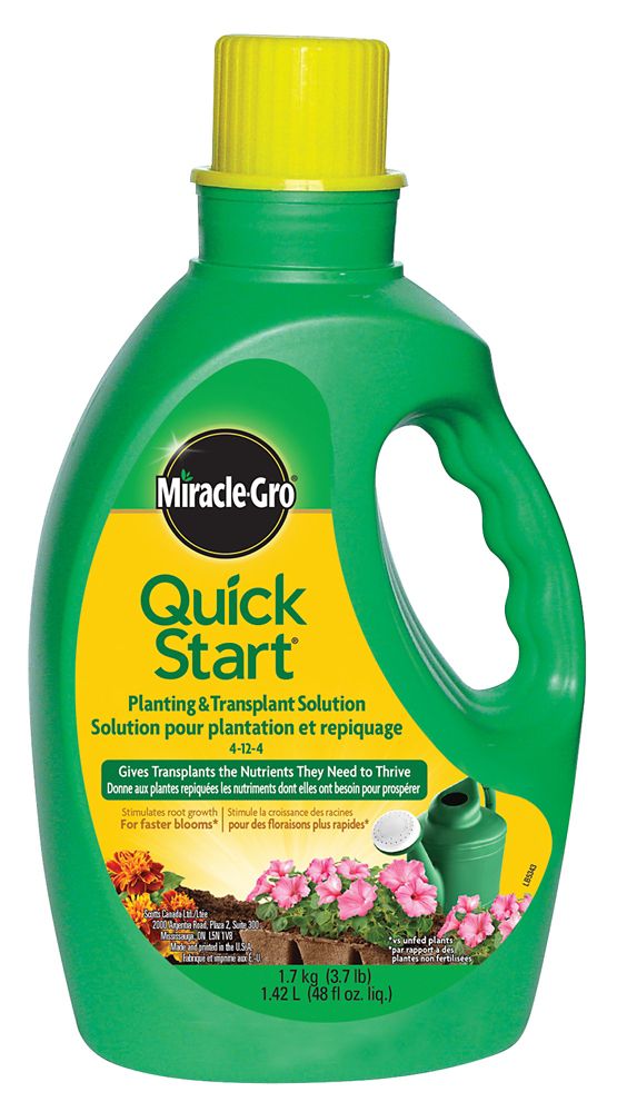 Miracle-Gro Quick Start planting and transplant starting solution is specially formulated to stimulate root growth, reduce transplant shock, and minimize root stress so that your houseplants, vegetables, and flowering plants can thrive. With a nutrient ratio of 4-12-4, this fertilizer will give your flowers, seedlings, and struggling plants a boost by delivering the nutrients necessary for healthy strong roots. Moving, replanting, and transplanting can be stressful for plants, but Miracle-Gro actually helps them get a jump-start in their new environment, and can even result in faster blooms compared with unfed plants. This easy-to-use plant food comes in a 1.42-litre jug; simply mix with water and apply it to your trees, shrubs, vegetables, flowers, and seedlings and watch them grow. | Miracle-gro Miracle-Gro Quick Start Plant Food – 4-12-4 – 1.42-L 3252106 Miracle-Gro | Quick Start Plant Food – 4-12-4 – 1.42-L .