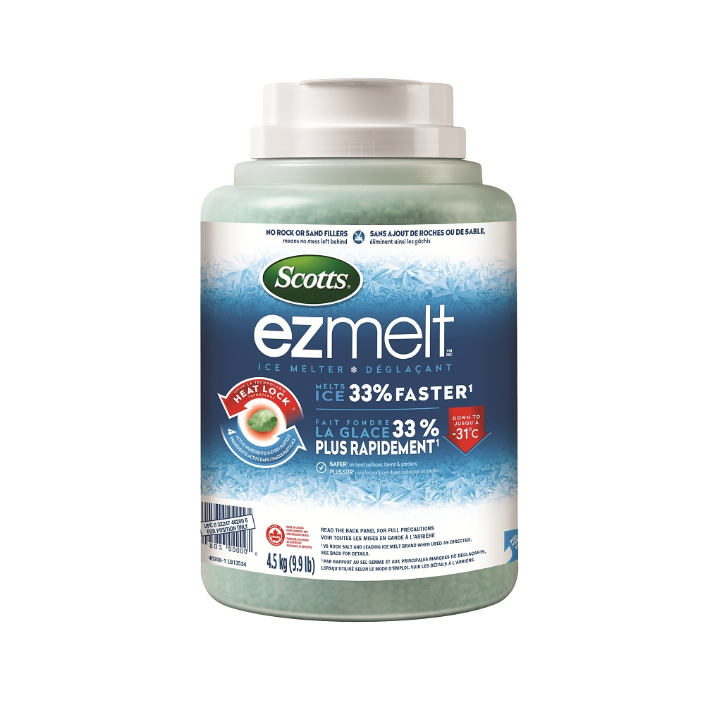 Want faster, less messy snow and ice melting. Use Scotts® ezMeltâ„¢ ice melter with Heat Lock® technology before or after a snowfall. Apply on sidewalks, driveways and other hard surfaces to melt snow and ice faster – without the mess of conventional rock and sand fillers. Scotts® ezMeltâ„¢ ice melter effectively melts ice in a wide range of temperatures down to -31 deg C. Inside each ice melt pellet are four active ingredients that are tough on ice, yet safer on lawns, hard surfaces and gardens. It creates a residual brine that helps keep ice from reforming and refreezing, too. To use, dispense directly from the convenient shaker jug or transfer to your favorite Scotts® spreader.