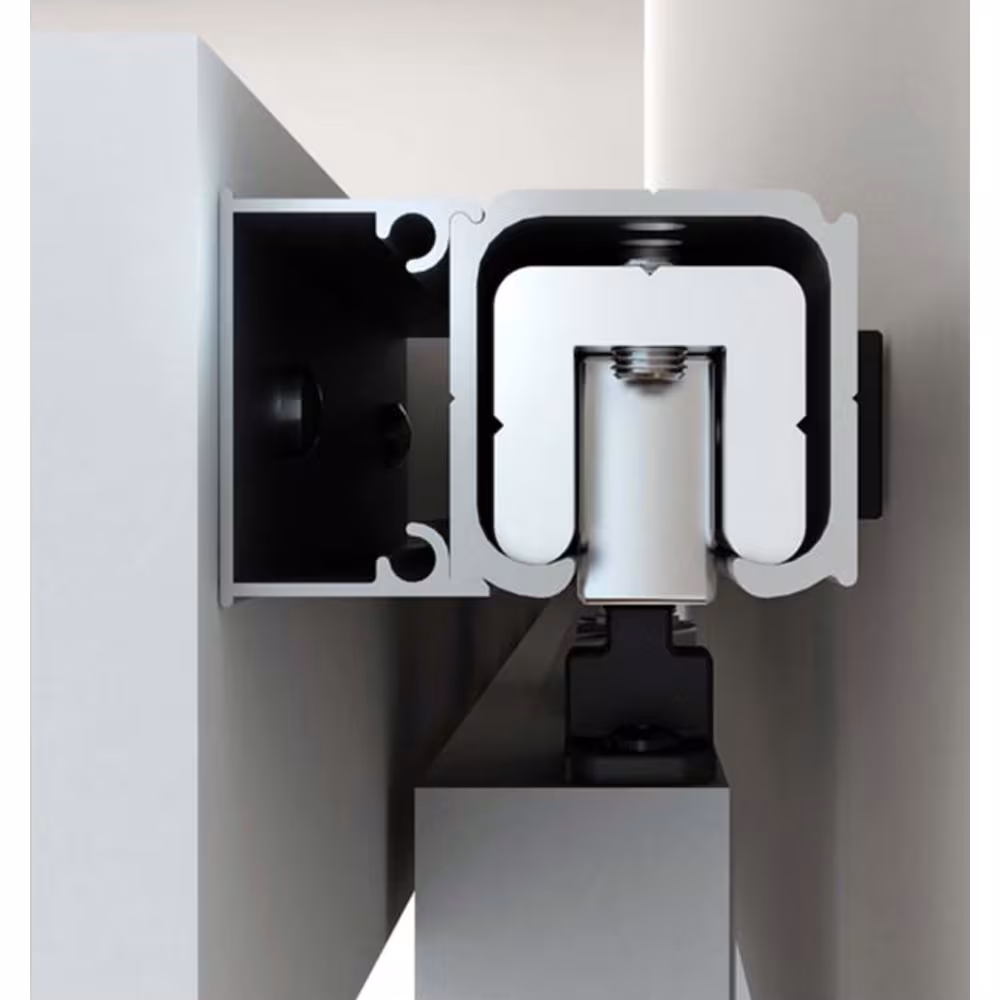 The traditional is a concealed wall mount sliding door kit for one wood door running on a box track with clip on wood fascia for a single wood door weighing up to 88 lb.