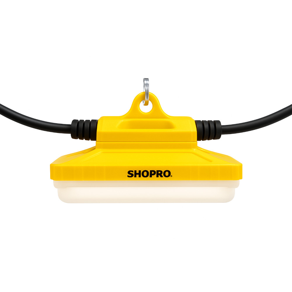 Light your worksite from end to end. Stretching 50 feet with five high-output LED heads, the SHOPRO L002772 delivers a total of 6,000 lumens of crisp 5,000K daylight illumination. Mounted via built-in carabiners, it’s quick to hang across scaffolding, rafters, or trusses. The rugged 18/3 SJTW cable, IP65 weather rating, and shatter-resistant head covers ensure it holds up under real site conditions. The low 60W draw makes it energy efficient, and its linkable design lets you connect up to 13 strings for extended coverage. Ideal for construction zones, tent rows, staging areas — anywhere you need reliable, uniform lighting in tough environments.