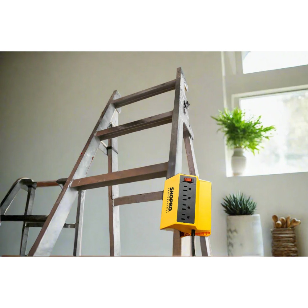 Bring power wherever you need it — fast. Meet the SHOPRO P010510 Quick Clamp Power Bar: a 4-outlet, 15 A / 125 V (1,875 W) jobsite essential that locks down where other power bars can’t. With a 2½″ jaw opening and throat depth, it clamps securely to ladders, workbenches, poles, scaffolding—virtually any stable surface. The unit features a durable ABS housing, a pivoting rubber pad for grip, and a 6′ 14/3 SJT cord for reliable reach. Ideal for contractors, renovators, and DIYers alike, the P010510 turns your workspace into a flexible electrical hub — no more stretching cords across walkways or struggling to find outlets. Power, convenience, and stability — all in a compact clamp-on design.