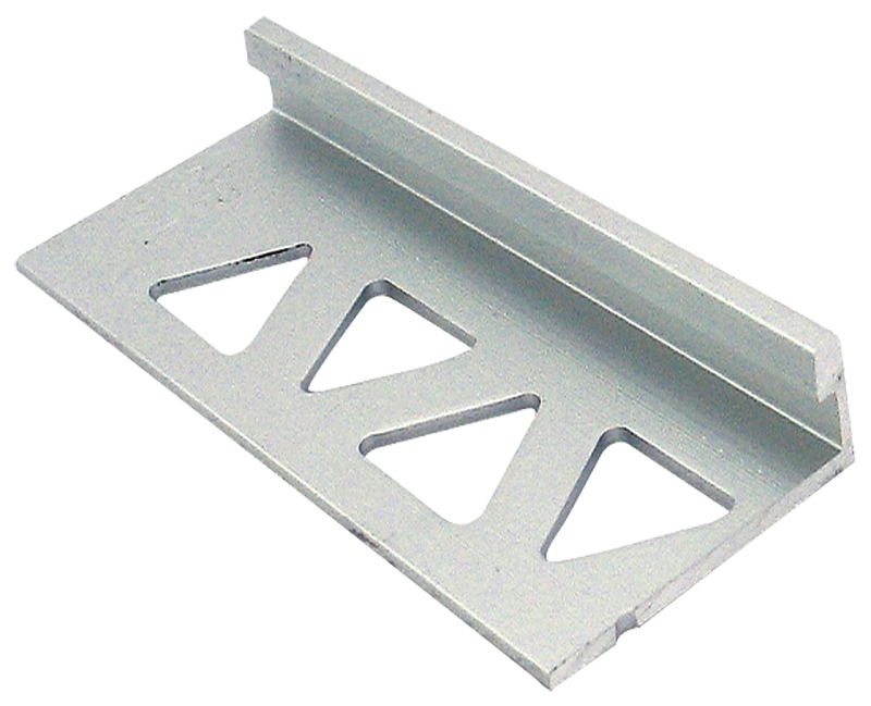 Flat tile edge for use with tile. Prepunched for easy setting into adhesive. Protects tile from damage while providing a finished butting edge for other flooring materials.