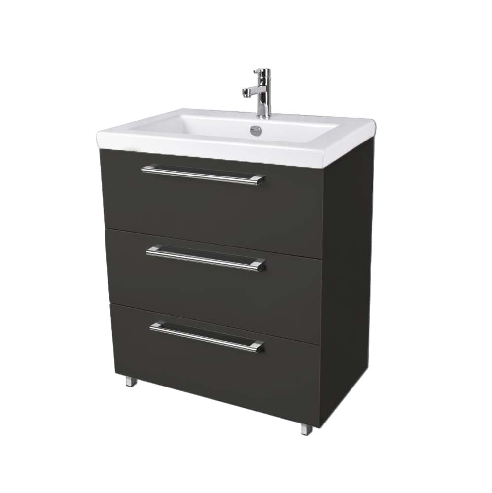 The Stella Collection of Vanities is crafted from Canadian components and is available in scratch-resistant acrylic, as well as melamine, thermofoil and glossy thermofoil. The soft close drawers open easily with a sleek chrome handle on each drawer. Our new three drawer vanities include stainless steel legs which are pre-cut for an optimal overall height. The first drawer has a cutout center for the drain, followed by two full bottom drawers.