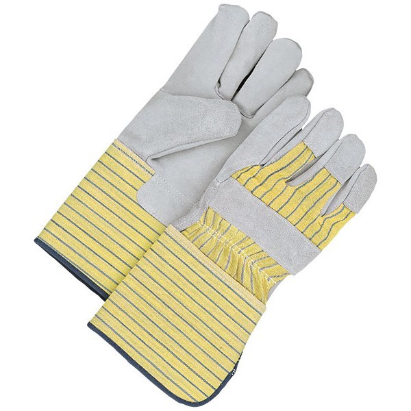 Split cowhide palm, index finger & fingertips; Cotton backhand with split leather knuckle strap; 1/2 jersey lining; 5″ rubberized cuff; Inside elastic wrist; Gunn cut with wing thumb.