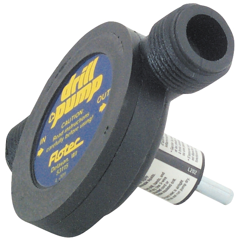 Thermoplastic construction. Works with electric drills. Ideal for pumping water or emptying oil. Compact design. The Flotec FPDMP21SA-P2 Self-Priming Drill Pump is ideal for repairs and home improvement projects. Perfect for emptying and overflowing dishwasher or washing machine, an aquarium or blocked sinks. Maximum pumping capacity of 225 gallons per hour with a max. drill speed of 1200 rpm. The Flotec drill pump is self-priming and it connects to most electric drills. It also features an inlet and discharge for easy connection to a standard garden hose. It can be used for unblocking sinks, emptying aquariums or water beds and emergency pumping. Use with electric drill, minimum 1200 RPM. Allows for easy oil changes on mowers, boats and cars.  Included hose kit completes the package.