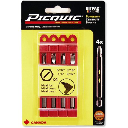 Since 1988 Picquic has been a trusted name of unique innovative and most importantly useful tools. Picquic Powerbit Bits come retail packaged with Bitpacs which link together with other Picquic Bitpac units enabling users to keep things organized and reduce loss of bits! SET INCLUDES: 5/32 3/16 1/4 9/32 Interlocking Bitpac sleeves for each bit See images above for more details!