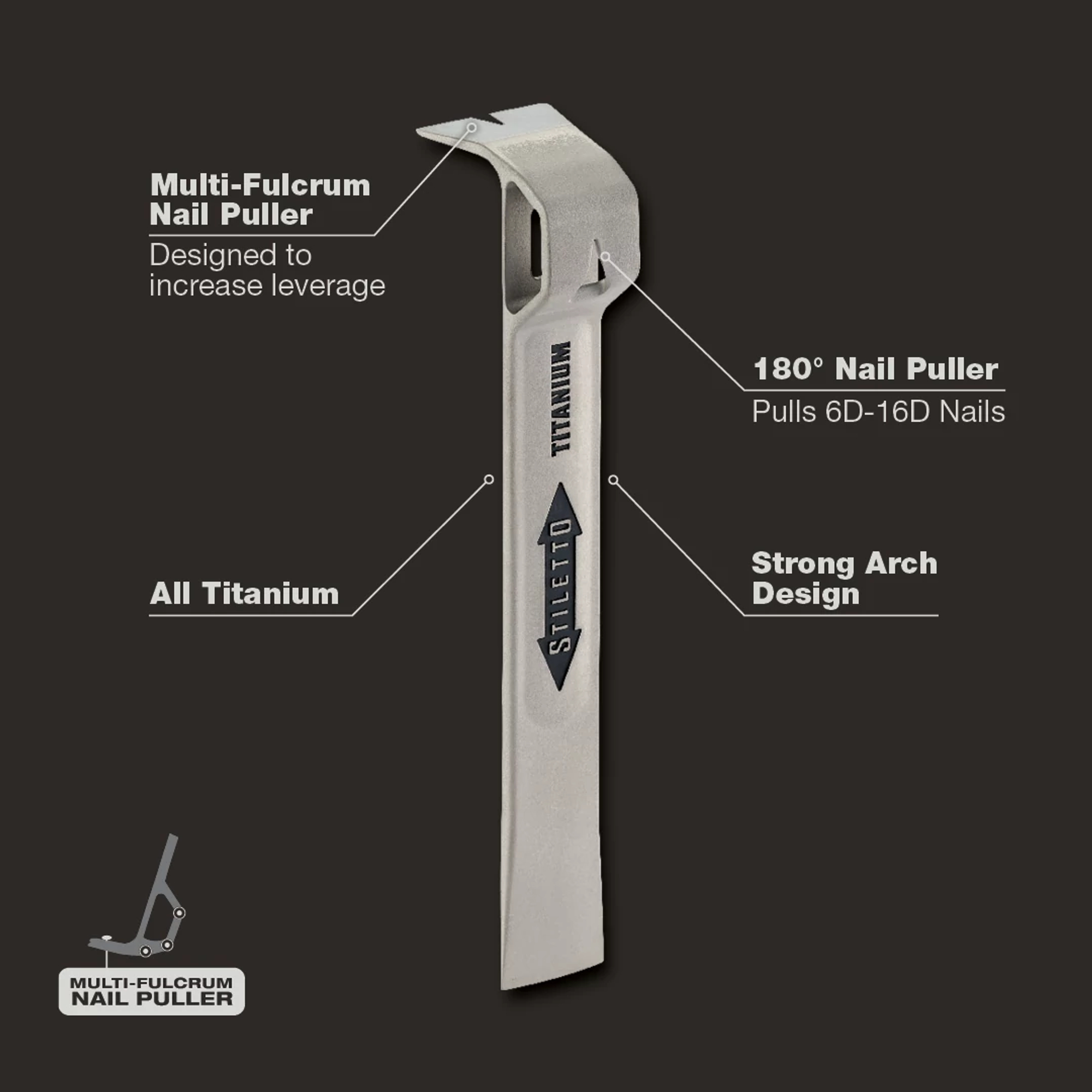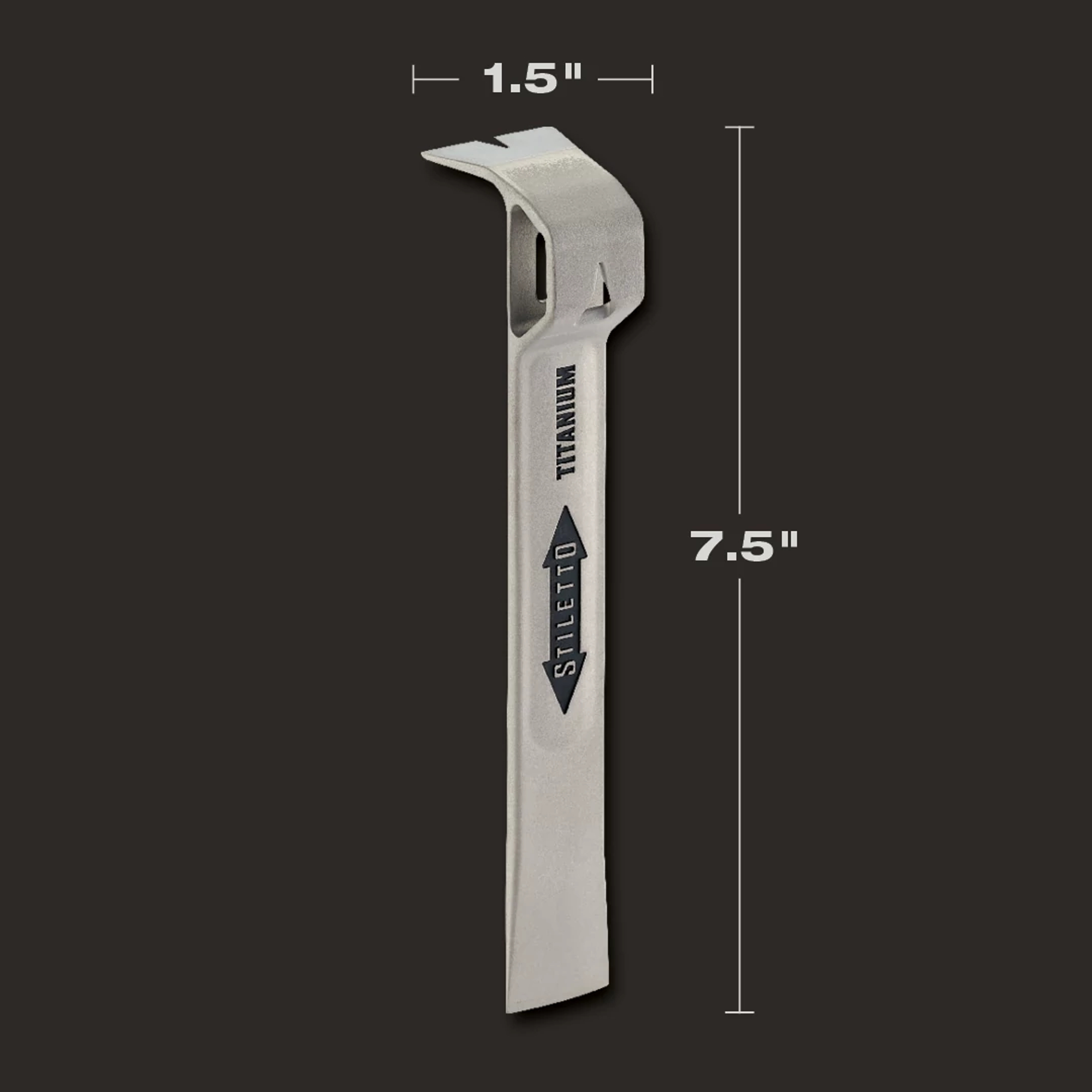 The pocket-size version of our six new titanium Flatbars, the Stiletto FB7G is an 3.2 oz solid titanium bar with super strong arch design. The FB7G glazer bar is incredibly strong and tough, and has a patented 180 degree nail puller in the arch. For setting windows and doors, moderate prying and scraping. Stiletto Tool company has been synonymous with high quality hand tools dating back to 1849. With our long history and strong reputation, the brand has evolved into the modern day standard for innovative, lightweight, ergonomic, productive, and professional tools. We set the standard with our line of premium titanium hand tools that span numerous trades such as framing, remodeling, finish work, siding, demolition, concrete, and drywall. Titanium is 45% lighter weight while providing the same striking force and strength as steel. Titanium tools also produce 10 times less recoil shock which helps reduce carpal tunnel syndrome. The combination of these features means less down time, more productivity, and most importantly less pain while working.