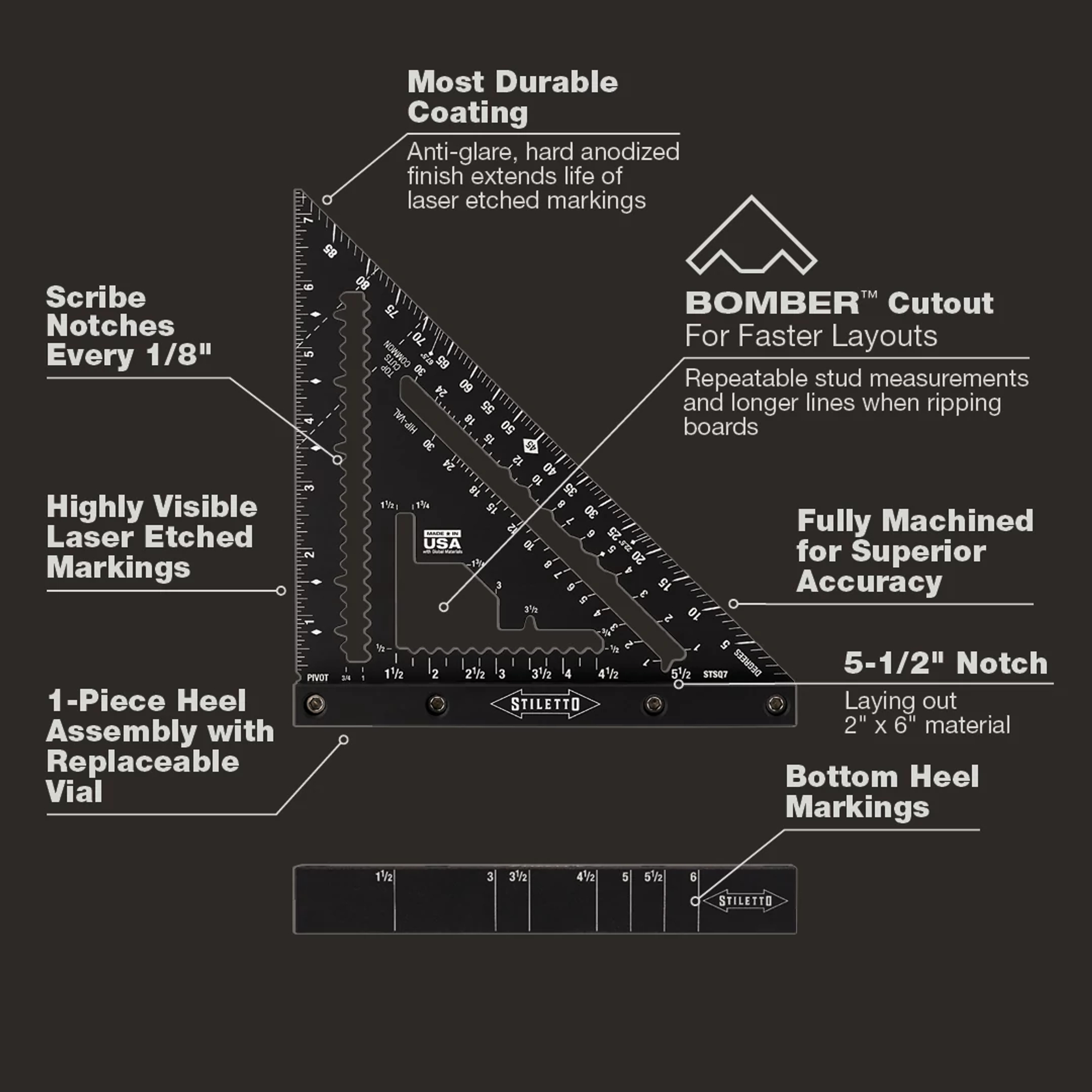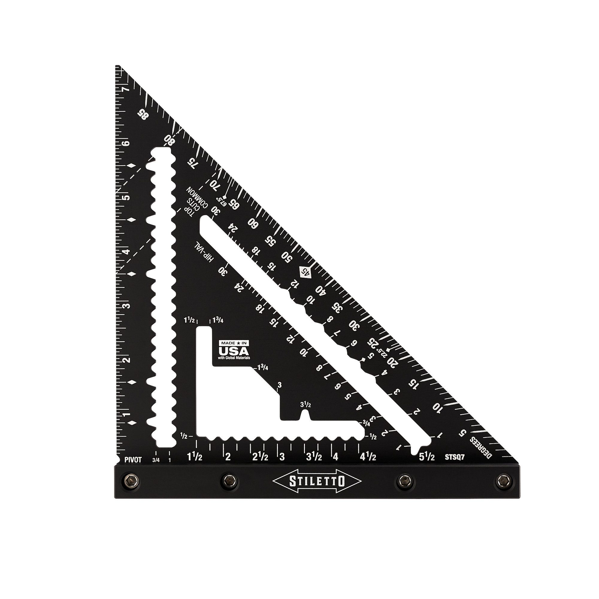 The STILETTO® 7” Carpenter Square is designed with more layout notches to help you build faster. Additional notches aid in laying out 2’x6′ material, ripping boards, and marking rafter pitches. The BOMBER™ Cutout allows for repeatable stud measurements, while the bottom heel markings provide marking versatility. The 7” Carpenter Square is fully machined, with an anti-glare finish and the most durable coating.